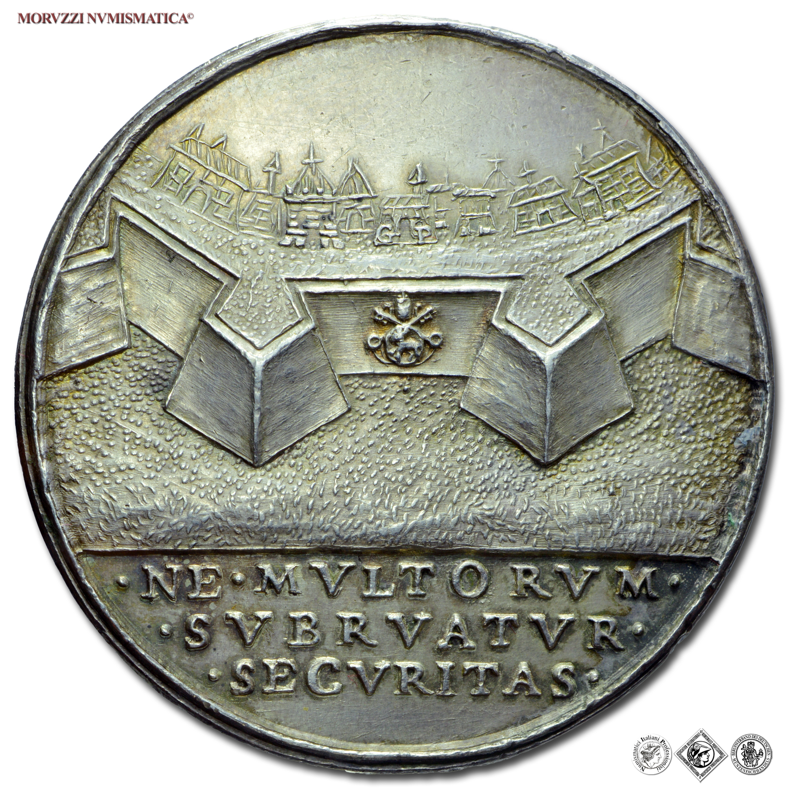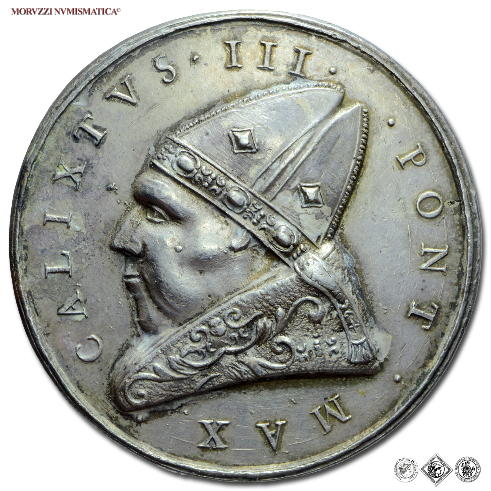 Stato Pontificio, CALLISTO III, de Borja, 1455-1458, MEDAGLIA DI RESTITUZIONE IN ARGENTO, Mura di Roma, Emissione: 1664, D/ CALIXTVS • III • PONT • MAX, busto a s. con mitra e piviale arabescato, R/ prospetto di un tratto delle mura di Roma, con al centro lo stemma del Papa; sullo sfondo edifici e chiese; in esergo, su tre righe: • NE • MVLTORVM • / • SVBRVATVR • / • SECVRITAS •, Opus Girolamo Paladino, Rif. bibl. Modesti CNORP I, 52; Armand I, 296, 12; Metallo: AR, gr. 37,35, (MP147424), Diam.: mm. 41,71, qFDC, (RRRRR)