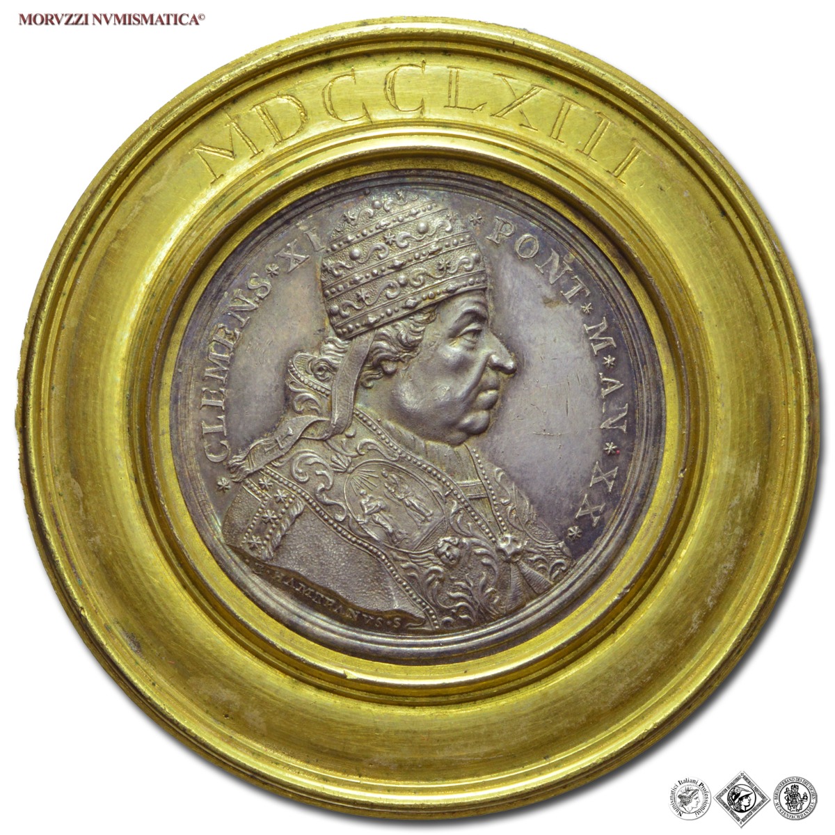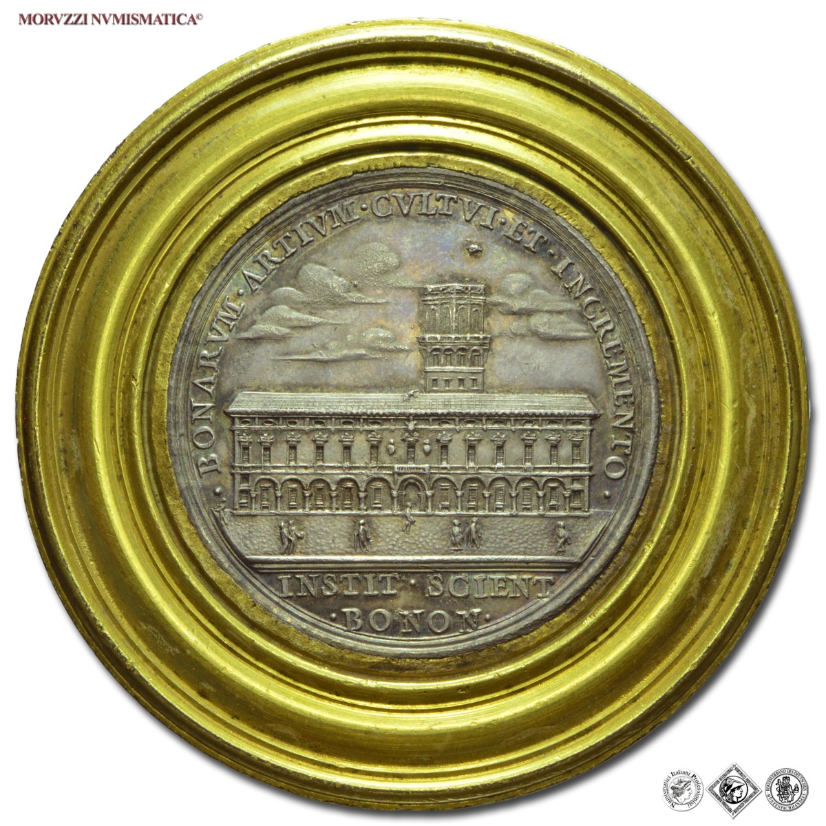 Stato Pontificio, CLEMENTE XI, Albani, 1700-1721, MEDAGLIA ANNUALE IN ARGENTO CONTORNIATA IN BRONZO DORATO, Ist. Arti e Scienze di Bologna, Emissione: 1720 AN XX, D/ * CLEMENS * XI * PONT * M * AN * XX *, busto a d. con triregno e piviale; sul taglio del busto: • E • HAMERANVS • S, R/ • BONARVM • ARTIVM • CVLTVI • ET • INCREMENTO •, prospetto anteriore dell'Istituto di Scienze in Bologna; in esergo, su due righe: INSTIT • SCIENT / • BONON •, Opus Francesco Corazzini, Rif. bibl. Bart., E720; Miselli, 120; Metallo: AR, gr. 63,10, (MP152202), Diam.: mm. 61,23, FDC, (RRR)