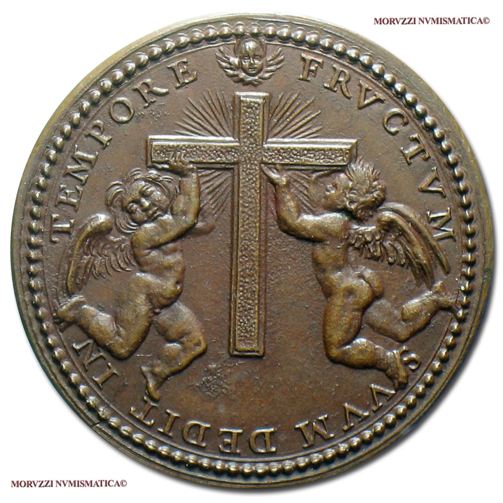 Stato Pontificio, INNOCENZO X, Pamphil, 1644-1655, MEDAGLIA STRAORDINARIA IN BRONZO, II anniversario dell'elezione, Emissione: AN III (1646), D/ INNOCENTIVS X • PON • MAX • AN • III, busto a d. con camauro, mozzetta e stola; sotto: G M •, R/ FRVCTVM SVVM DEDIT IN TEMPORE, croce radiante sostenuta da due angeli, Opus Gaspare Morone, Rif. bibl. Miselli, 403; Metallo: AE, gr. 13,21, (MP43229), Diam.: mm. 32,07, FDC, (RR)