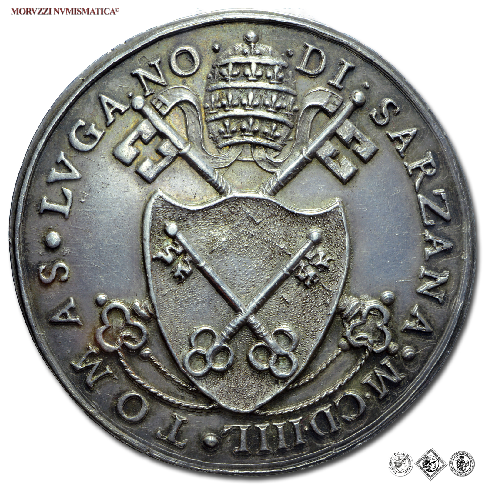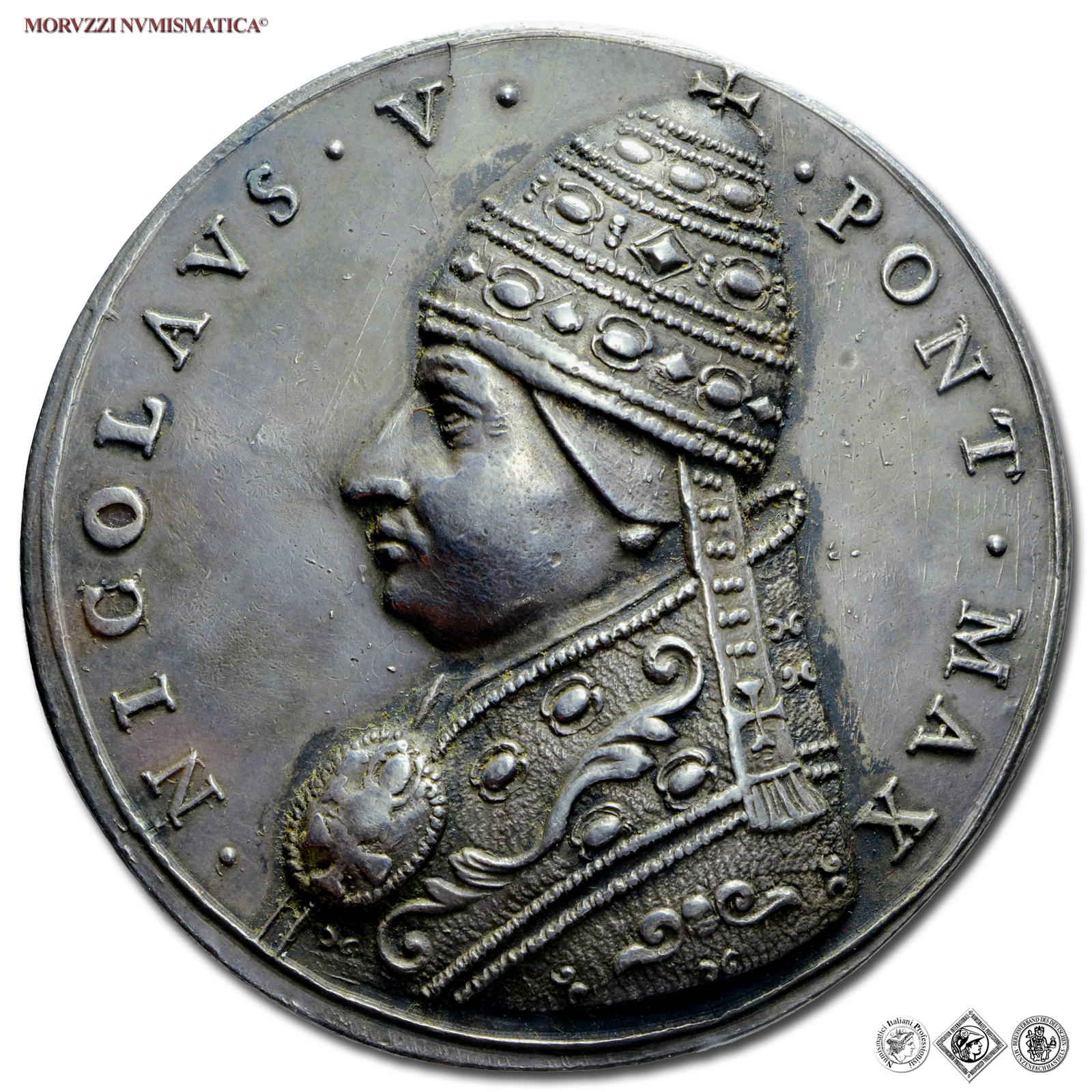 Stato Pontificio, NICOLO' V, Parentucelli, 1447-1455, MEDAGLIA DI RESTITUZIONE IN ARGENTO, Elezione Stemma, Emissione: Fine XVII sec., D/ • NICOLAVS • V • PONT • MAX, busto a s., con triregno e piviale decorato con arabeschi, R/ • TOMAS • LVGANO • • DI • SARZANA • MCDIIIL •, stemma papale, su chiavi decussate sormontato da triregno, Opus Girolamo Paladino, Rif. bibl. Modesti CNORP I, 30; Armand III, 142; Metallo: AR, gr. 39,90, (MP147427), Diam.: mm. 44,50, mSPL, (RRR)