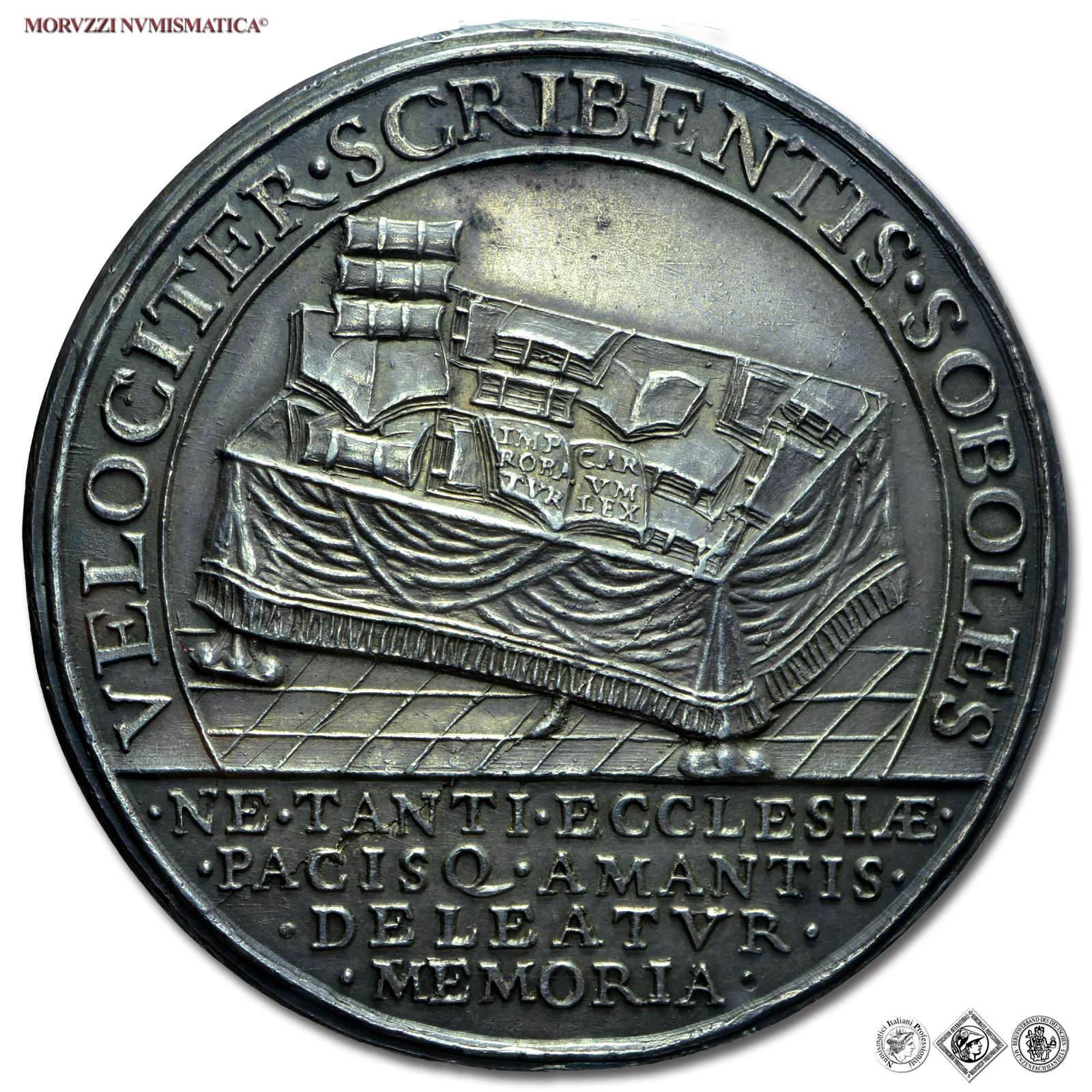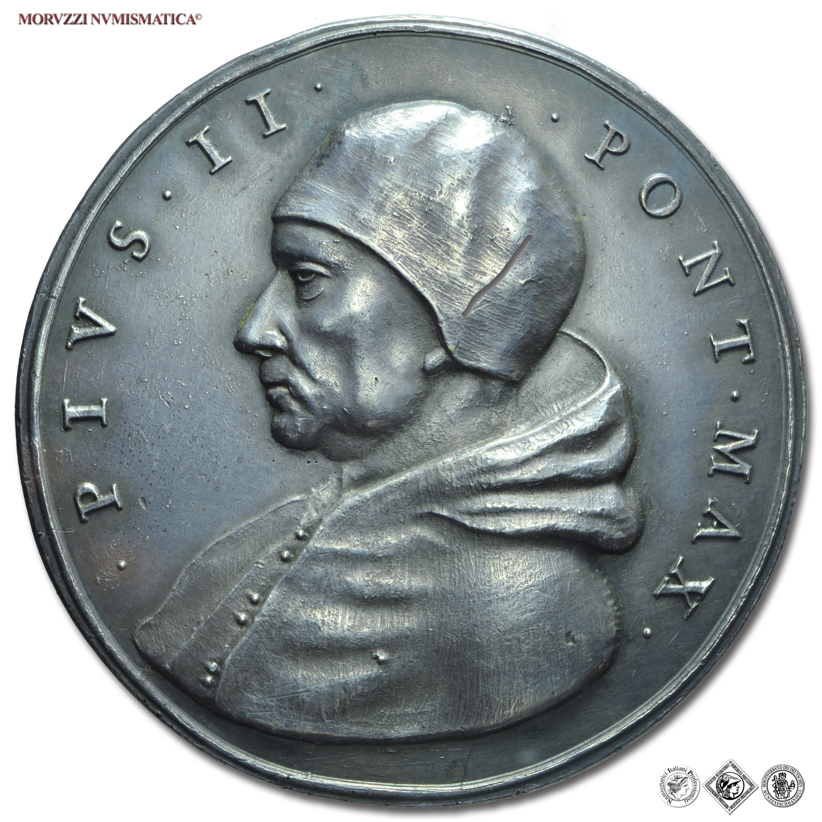 Stato Pontificio, PIO II, Piccolomini, 1458-1464, MEDAGLIA DI RESTITUZIONE IN ARGENTO, Attività letteraria del Pontefice, Emissione: 1664, D/ • PIVS • II • • PONT • MAX •, busto a s. con camauro e mozzetta, R/ VELOCITER • SCRIBENTIS • SOBOLES, tavolo colmo di libri, tra cui uno aperto su cui: IMPROBA TVRCARVM LEX. In esergo, su quattro righe: • NE • TANTI • ECCLESIAE • / • PACISQ • AMANTIS • / • DELEATUR • / • MEMORIA •, Opus Girolamo Paladino, Rif. bibl. Modesti CNORP I, 69; Armand I, 297; Metallo: AR, gr. 39,42, (MP147428), Diam.: mm. 44,61, qFDC, (RRR)