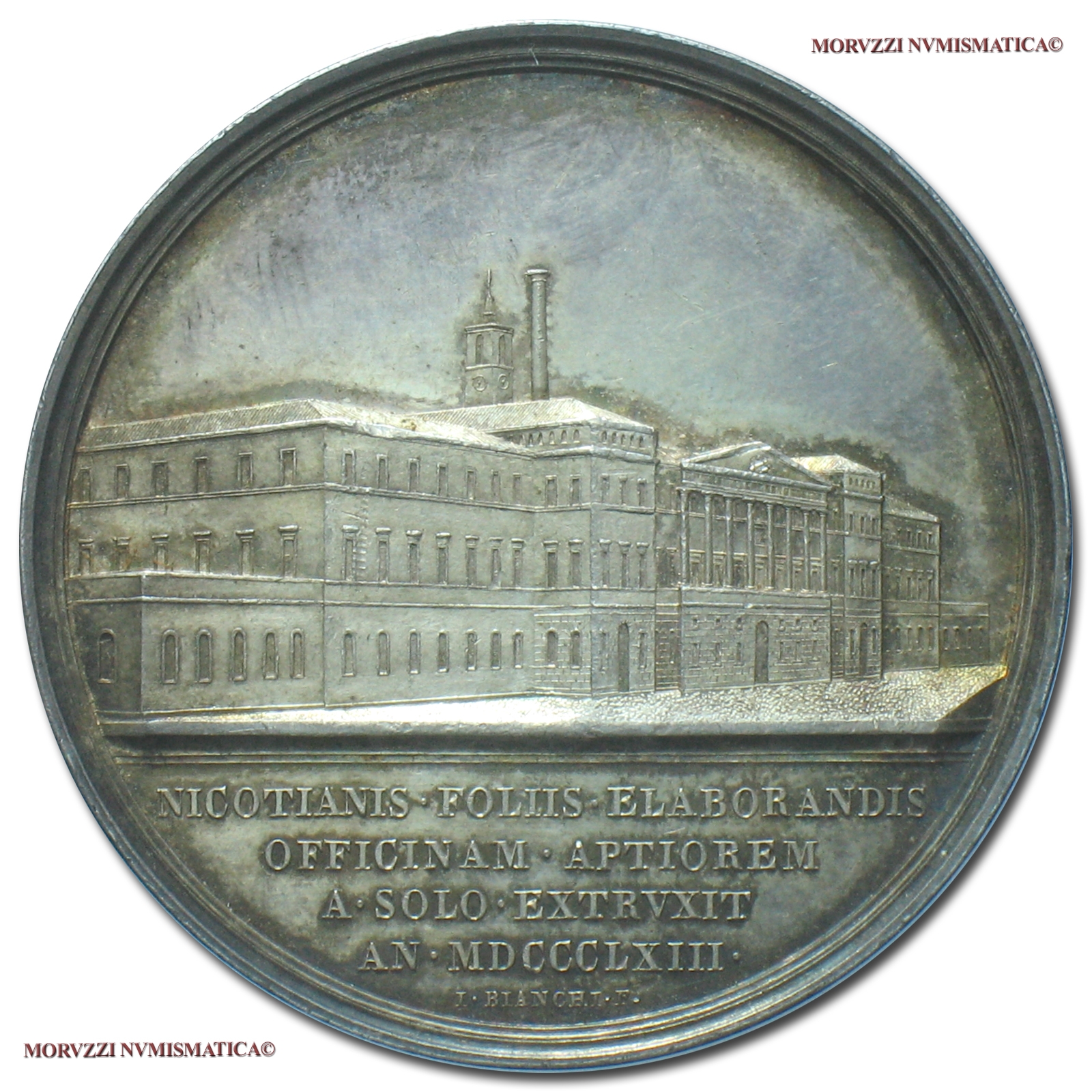Stato Pontificio, PIO IX, Mastai Ferretti, 1846-1878, MEDAGLIA ANNUALE IN ARGENTO, Nuova Manifattura dei tabacchi, Emissione: 1863 AN XVIII, D/ PIVS • IX • PONT • MAX • AN • XVIII •, busto a s., con berretto, mozzetta e stola; sotto: I • BIANCHI F •, R/ il nuovo edificio della Manifattura dei Tabacchi; in esergo: NICOTIANIS • FOLIIS • ELABORANDIS / OFFICINAM • APTIOREM / A • SOLO • AXTRVXIT / AN • MDCCCLXIII •, Opus Ignazio Bianchi, Rif. bibl. Bart., E863; Metallo: AR, gr. 37,64, (MP136718), Diam.: mm. 43,48, SPL