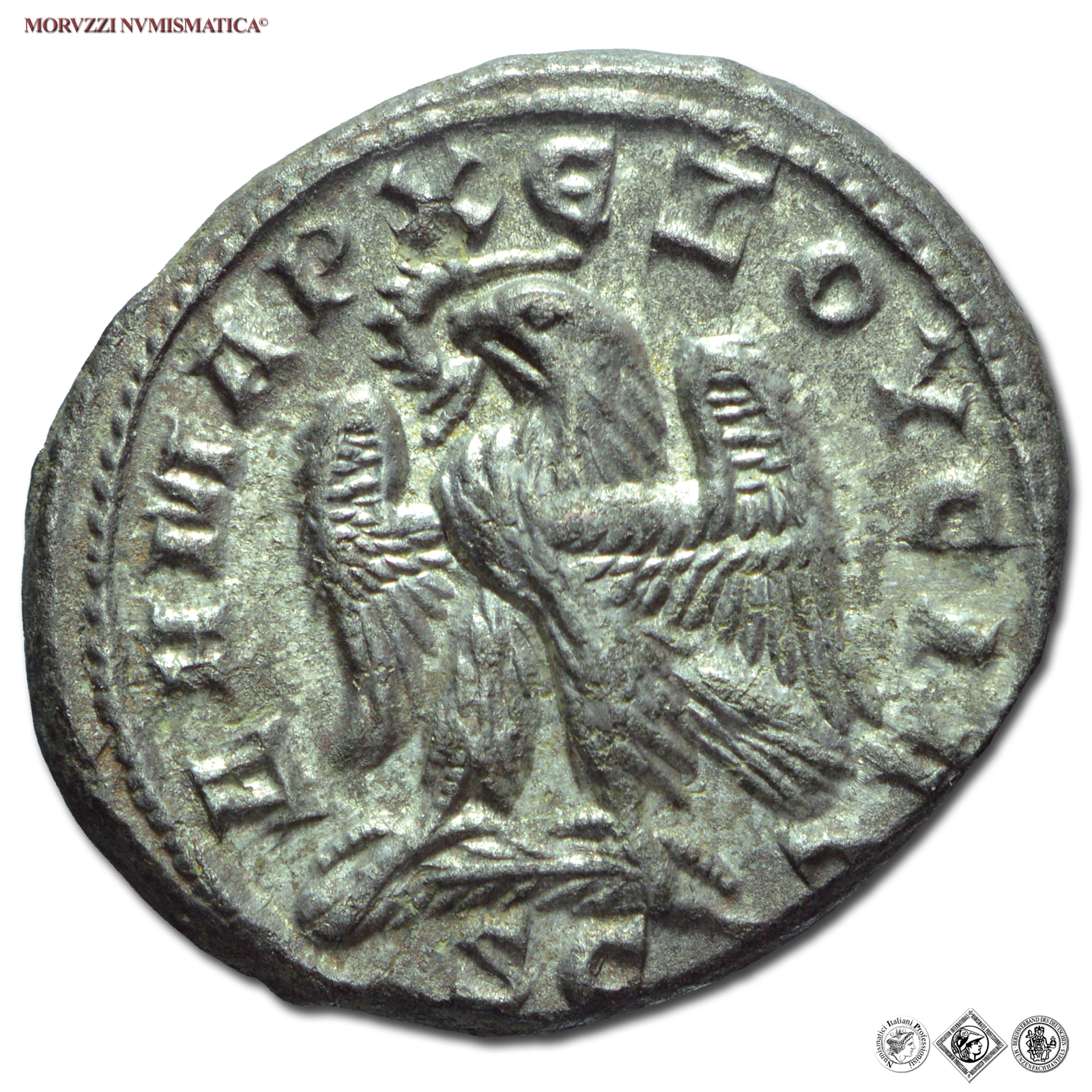 Impero Romano, Siria, TRAIANO DECIO, 249-251 d.C., TETRADRAMMA, Emissione: 250-251 d.C., D/ AYT K Γ MЄ KY TPAIANOC ΔЄKIOC CЄB, busto laureato con paludamento e corazza visto di spalle a destra, R/ ΔHMAPX ЄΞOYCIAC / S C, aquila stante di fronte su un ramo di palma ad ali aperte volta a sinistra con corona nel becco, Zecca di Antiochia*, Rif. bibl. Prieur, 574; Metallo: AR, gr. 13,95, (MR70578), Diam.: mm. 27,85, SPL