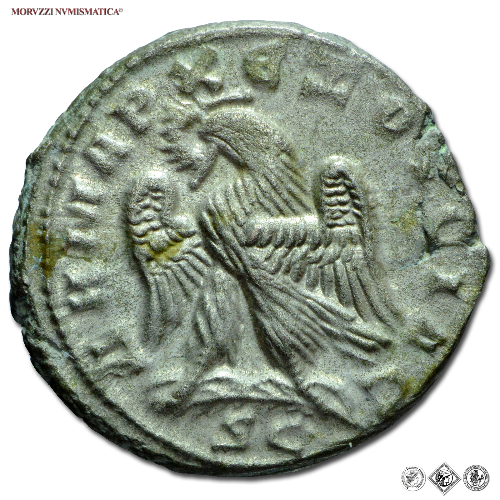 TRAIANO DECIO, TETRADRAMMA, 250-251 d.C., ΔHMAPX ЄΞOYCIAC / S C aquila ad ali aperte con corona nel becco, zecca di Antiochia in Siria, ARGENTO, SPL, (Prieur 582) / monete romane imperiali provinciali antiche d'argento - moneta romana - Impero Romano)