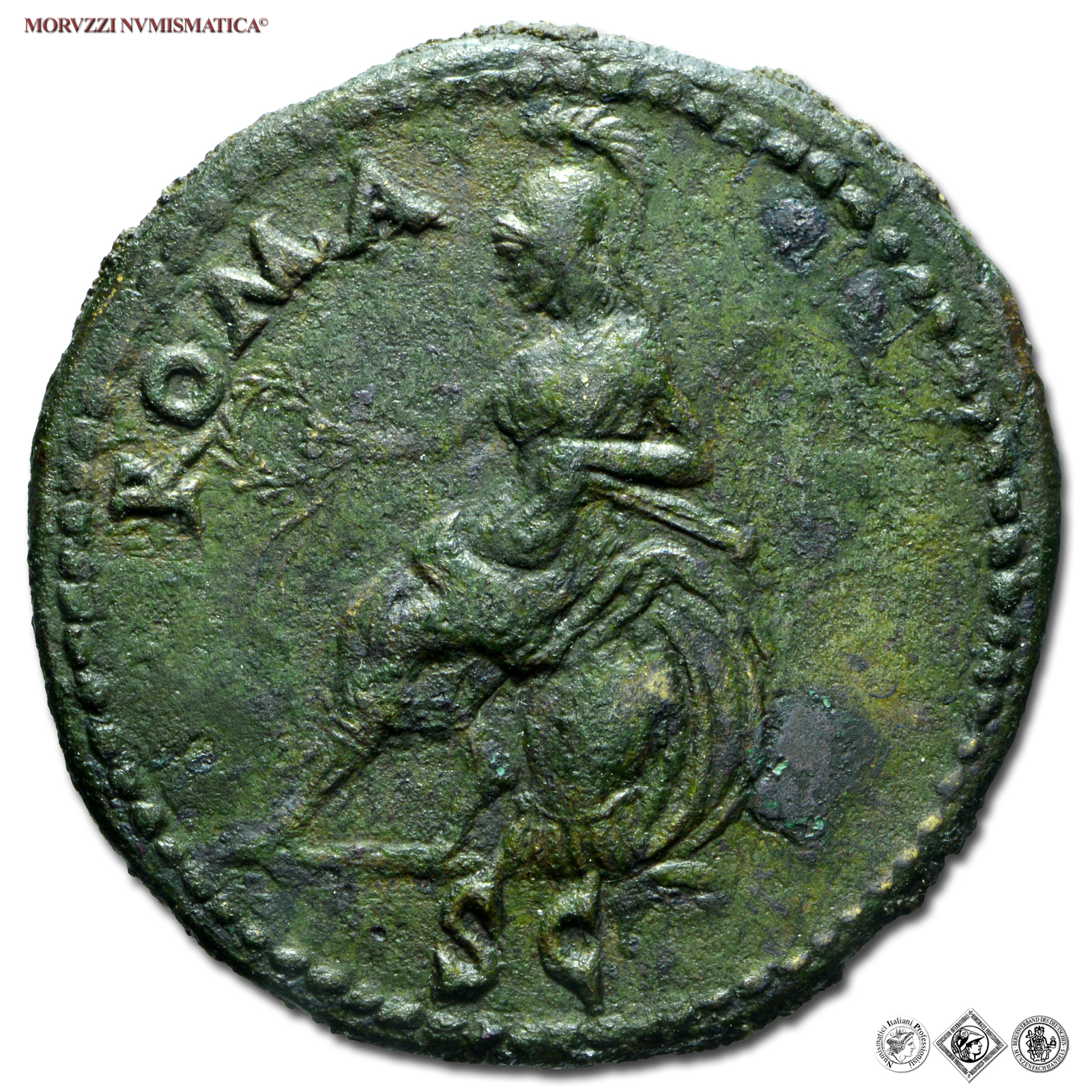 Impero Romano, DOMIZIANO, 81-96 d.C., DUPONDIO, Emissione: 82 d.C., D/ IMP D CAES DIVI VESP F AVG P M TR P P P COS VIII, testa radiata a destra, R/ ROMA / S C, Roma galeata seduta a sinistra su di una corazza con corona nella destra e parazonio nella sinistra. Dietro uno scudo, Zecca di Tracia, Rif. bibl. R.I.C. II ed., 839/R2; Cohen, 410/Fr. 6; Metallo: AE, gr. 12,80, (MR145855), Diam.: mm. 30,09, mBB, (RR)
