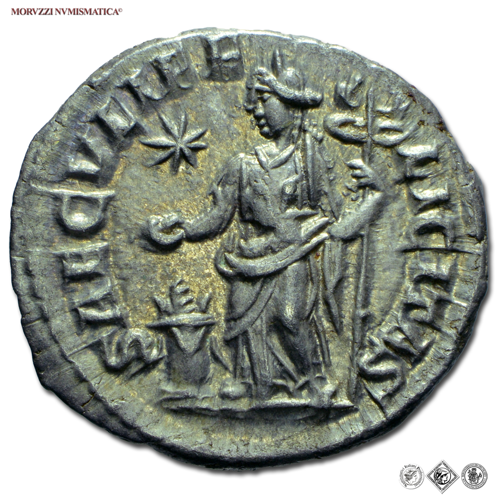GIULIA MESA, DENARIO, 218-222 d.C., SAECVLI FELICITAS la Felicitas con una patera sacrifica su un altare acceso e tiene un caduceo; stella nel campo, Zecca di Roma, ARGENTO, SPL, (RIC 272) / monete romane imperiali antiche d'argento (Impero Romano)