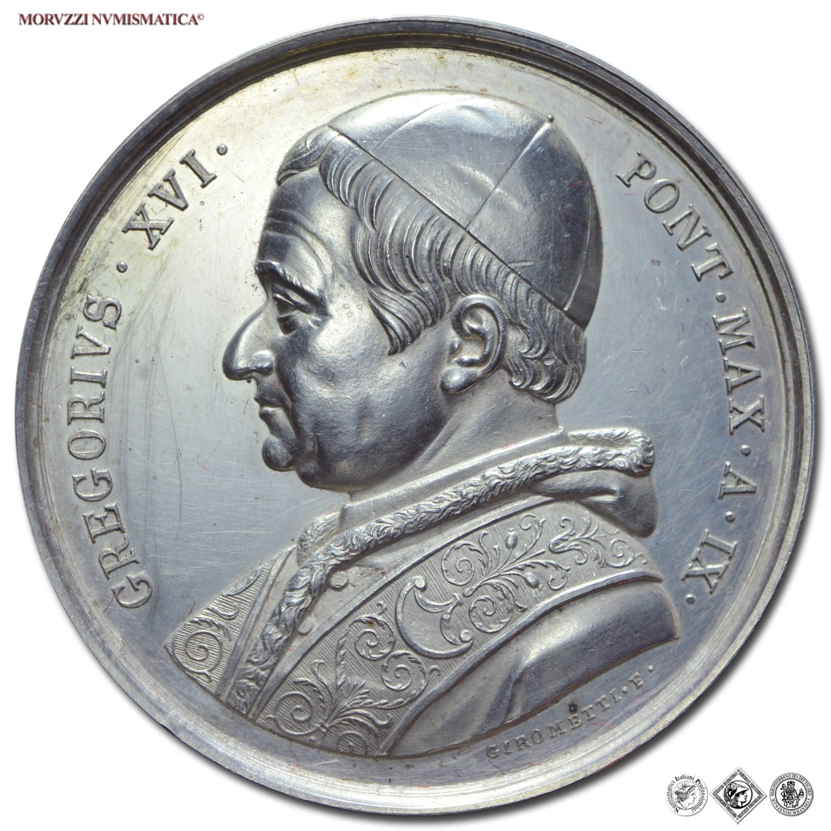 Stato Pontificio, GREGORIO XVI, Cappellari, 1831-1846, MEDAGLIA ANNUALE IN ARGENTO, Canonizzazioni del 1839, Emissione: 1839 A IX, D/ GREGORIVS • XVI • PONT • MAX • A • IX •, busto a s., con berrettino, mozzetta e stola; sotto: GIROMETTI • F •, R/ MIRABILIS • DEVS • IN • SANCTIS • SVIS •, cinque santi stanti, irradiati dalla luce divina; in esergo, su due righe: VII • KAL • IVN / M • DCCC • XXXVIIII •, Opus Giuseppe Girometti, Rif. bibl. Bart., E839; Metallo: AR, gr. 32,86, (MP141789), Diam.: mm. 44,33, FDC, (NC)