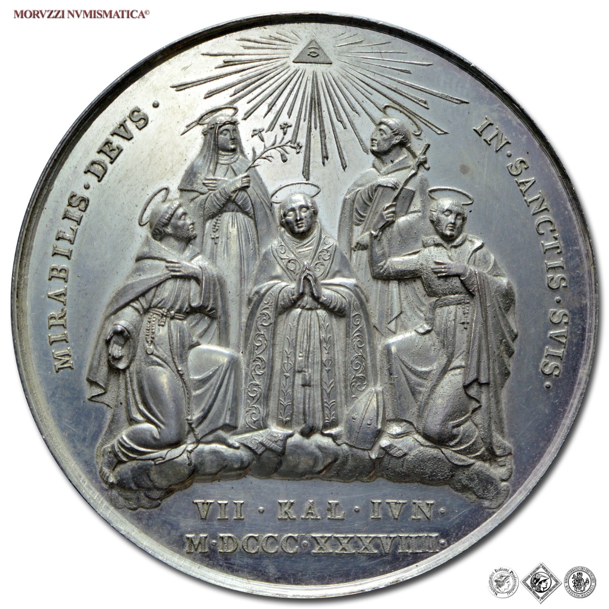 Canonizzazioni del 1839, Emissione: 1839 A IX, Opus Giuseppe Girometti, Rif. bibl. Bart., E839; Metallo: AR, gr. 32,86, (MP141789), Diam.: mm. 44,33, FDC, (NC)