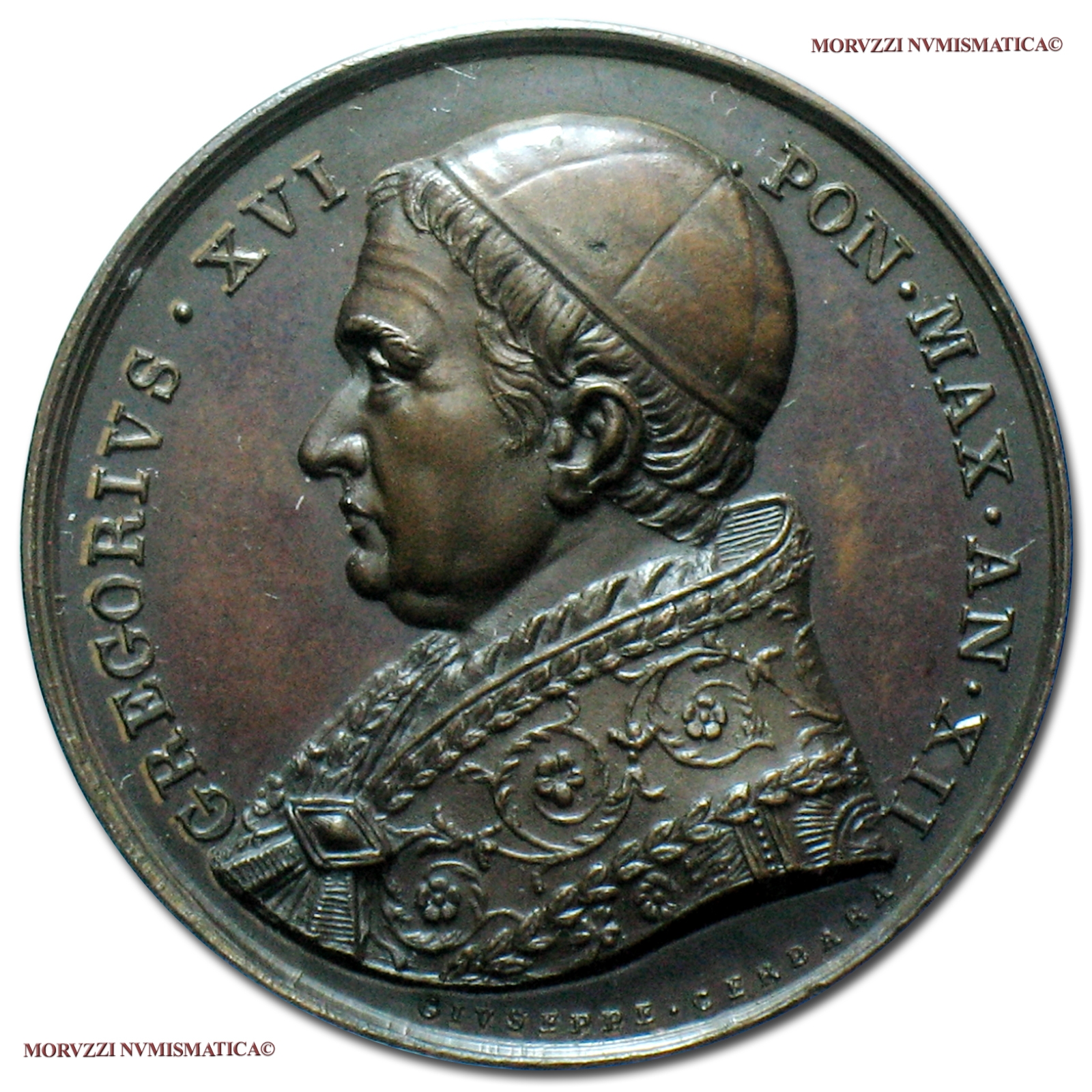 Stato Pontificio, GREGORIO XVI, Cappellari, 1831-1846, MEDAGLIA PREMIO IN BRONZO, Benemerenti del Comune di Roma, Emissione: AN XII (1842), D/ GREGORIVS • XVI • PON • MAX • AN • XII, busto a s. con berretto e piviale; sotto: GIVSEPPE • CERBARA, R/ * ALMAE VRBIS COSS * BENEMERENTI, in corona di quercia fermata da nastri incrociati: stemma coronato del Comune di Roma, Opus Giuseppe Cerbara, Rif. bibl. Boccia, 164; Metallo: AE, gr. 17,70, (MV54370), Diam.: mm. 32,52, qFDC, (RRR)