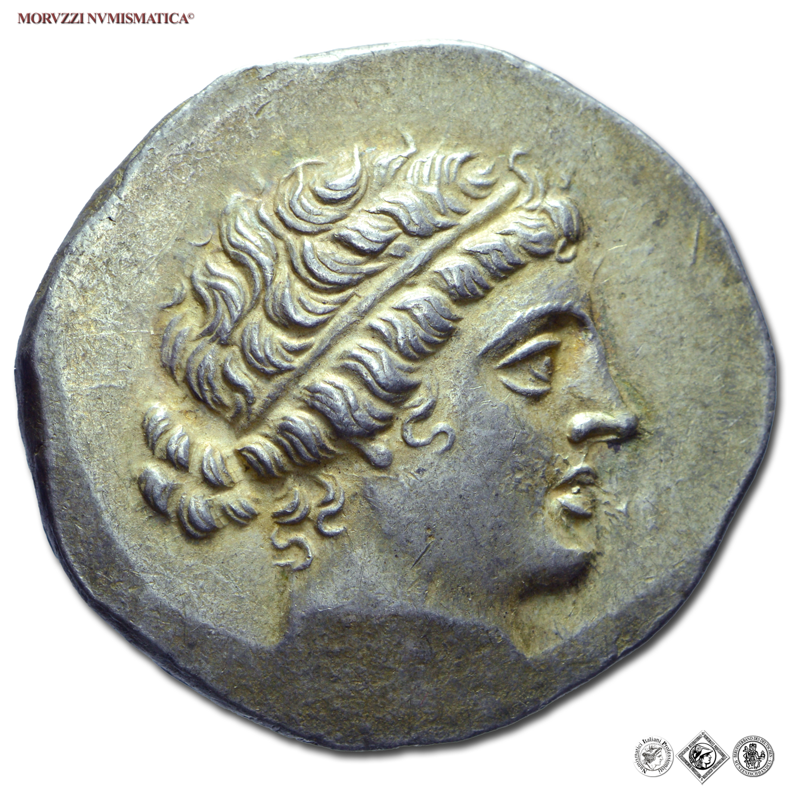 Eolia, KYME, TETRADRAMMA, Emissione: 165-140 a.C., D/ testa dell'amazzone Kyme a d., con la tenia, R/ KYMAIΩN, cavallo rampante a d., tazza con un manico sotto la zampa anteriore sollevata; in esergo: MHTPOΦANHΣ, il tutto all'interno di una corona, Zecca di Kyme, Magistrato: Metrophanes, Rif. bibl. SNG Dan., 104; Metallo: AR, gr. 16,72, (MG148987), Diam.: mm. 31,93, mSPL