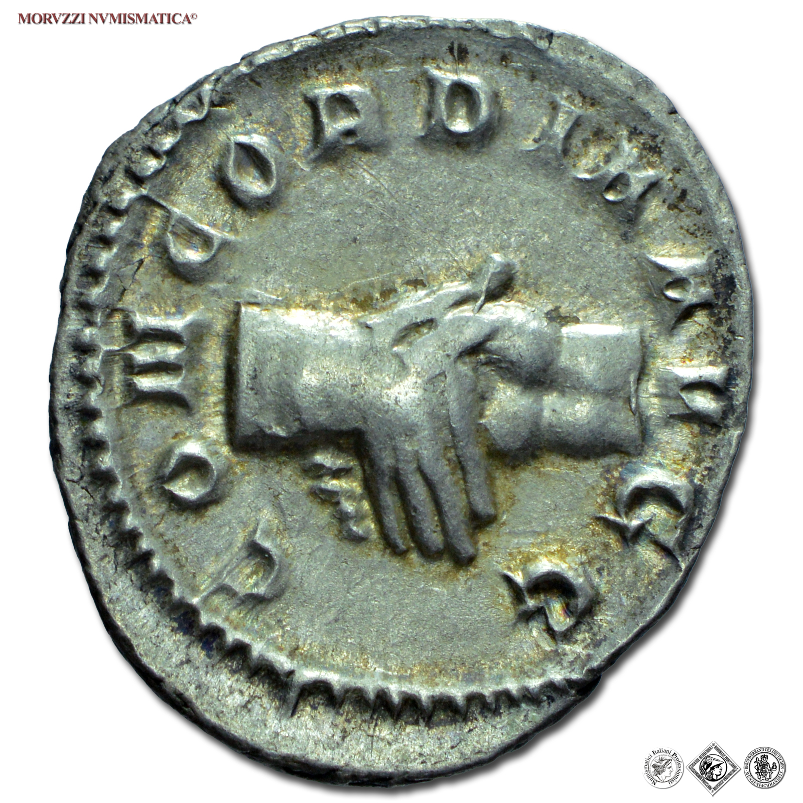 Impero Romano, ERENNIO ETRUSCO, Cesare, 251 d.C., ANTONINIANO, Emissione: 250-251 (?) d.C., D/ Q HER ETR MES DECIVS NOB C, busto radiato con paludamento e corazza visto di spalle a destra, R/ CONCORDIA AVGG, stretta di mani, Zecca di Roma, Rif. bibl. R.I.C., 138/R; Cohen, 4; Metallo: AR, gr. 3,46, (MR24618), Diam.: mm. 22,69, SPL, (R)