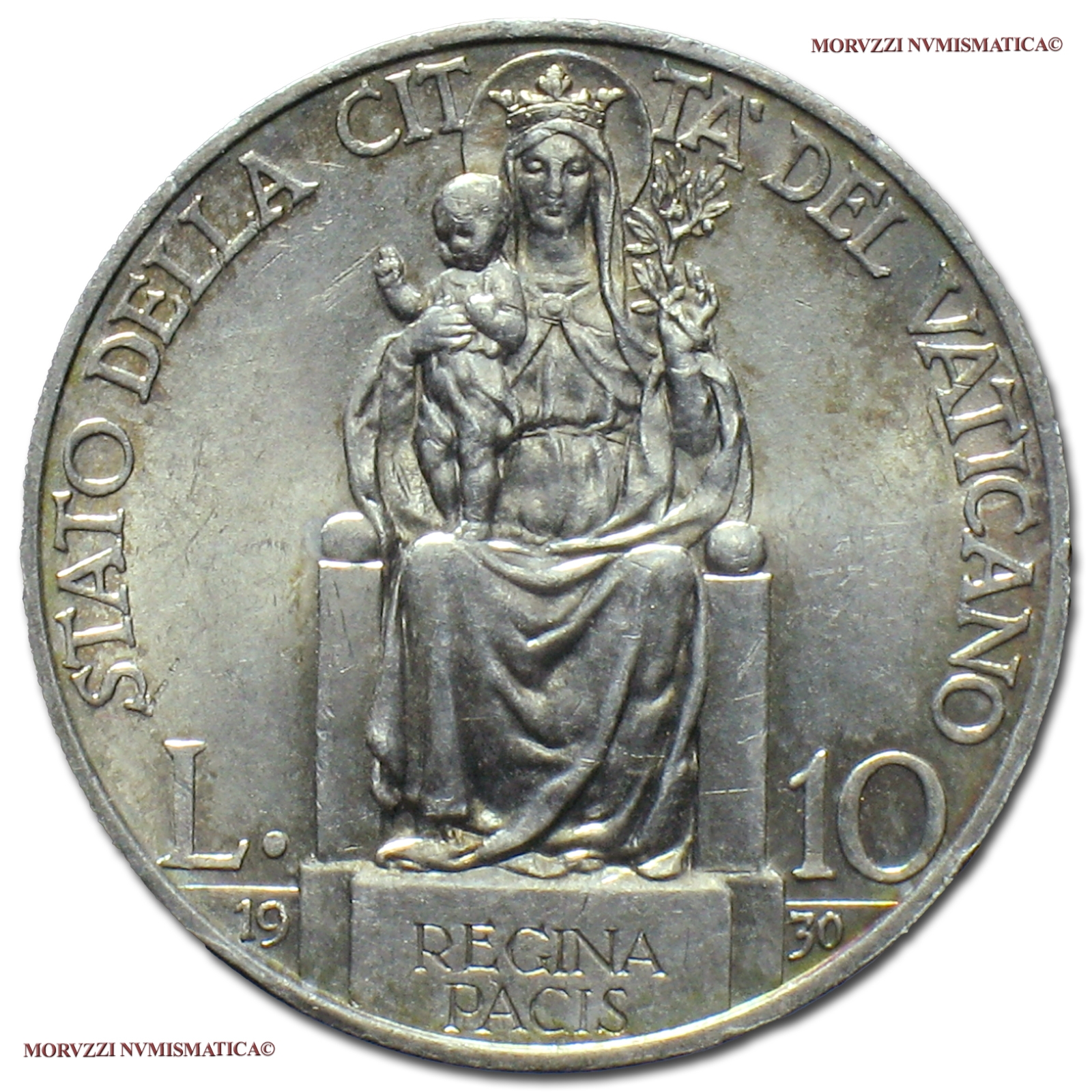 Città del Vaticano, PIO XI, Ratti, 1922-1939, 10 LIRE, Emissione: 1930 A IX, D/ PIVS XI PONT • MAX • A • IX, busto con berretto, mozzetto e stola a s.; MISTRVZZI / A • MOTTI • INC • in basso a d., R/ STATO DELLA CITTA' DEL VATICANO, immagine della maternità; L. 10 e 1930 in basso ai lati; REGINA / PACIS in esergo, Zecca di Roma, Rif. bibl. Pagani, 623; Metallo: AR, gr. 10,00, (MX111880), Diam.: mm. 27,07, qFDC