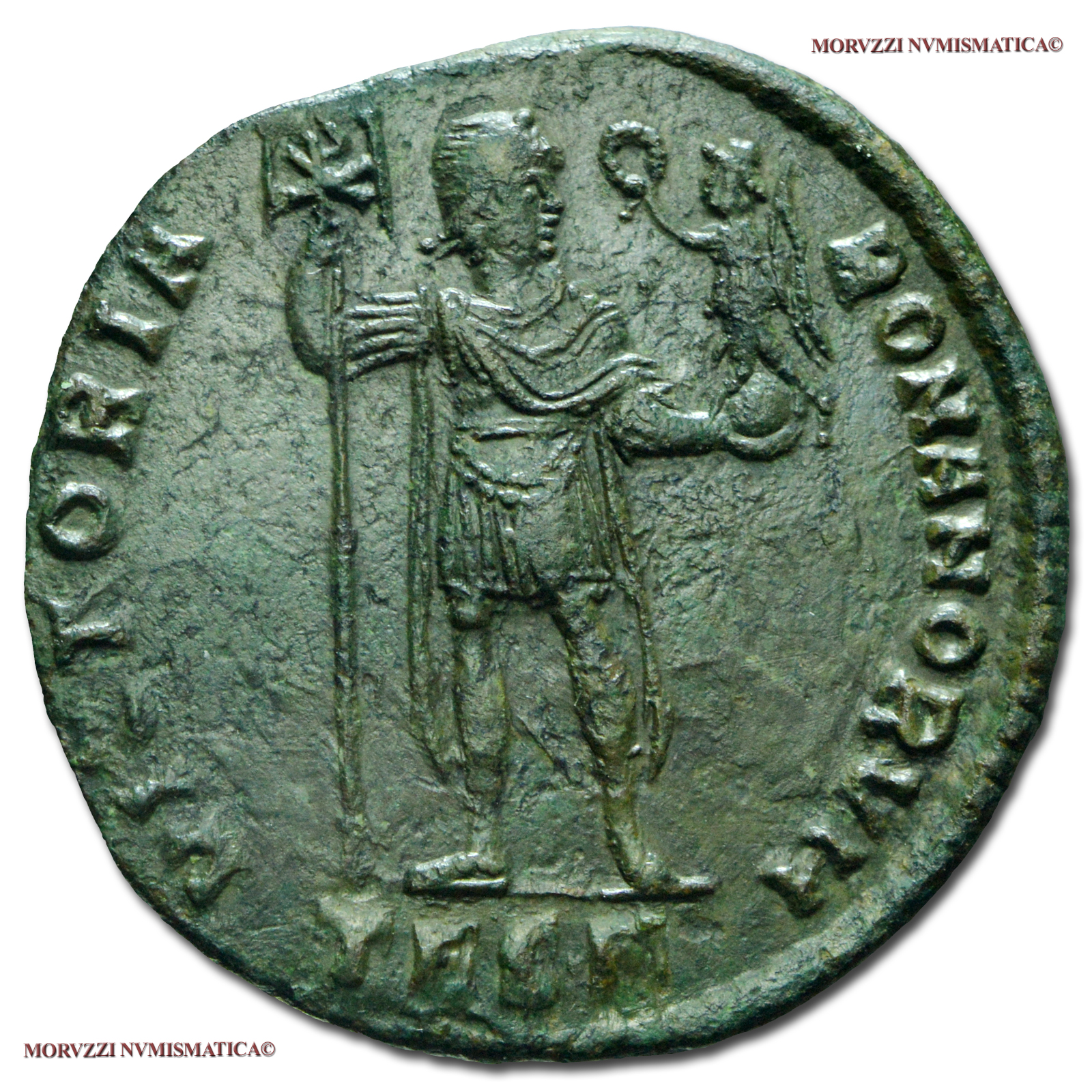 Impero Romano, GIOVIANO, 363-364 d.C., MAIORINA, Emissione: 363-364 d.C., D/ D N IOVIANVS P F P P AVG, busto diademato con paludamento e corazza a destra, R/ VICTORIA ROMANORVM / TESA, l'imperatore in abiti militari stante di fronte volto a destra con labaro con cristogramma nella mano destra e globo niceforo nella sinistra, Zecca di Tessalonica*, Rif. bibl. R.I.C., 235/S; Cohen, 23/Fr.8; Metallo: AE, gr. 8,77, (MR26864), Diam.: mm. 26,68, qSPL, (R)