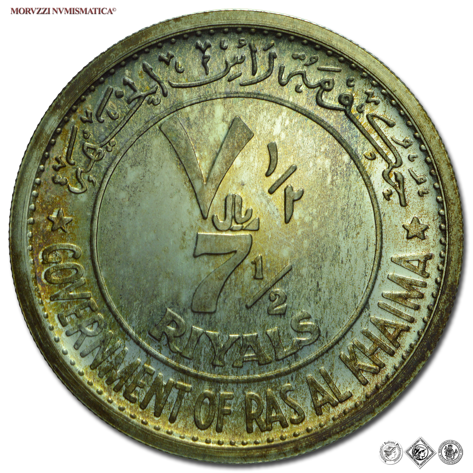 Ras Al-Khaima, SAQR BIN MUHAMMAD AL-QASIMI, 7 1/2 RIYALS, Centenario di Roma capitale, Emissione: 1970, D/ Valore all'interno del cerchio e Governo di Ras al-Khaimah in arabo in alto e in inglese in basso, R/ Romolo nelle vesti di un giovane pastore atletico, ricoperto di pelli, traccia la linea rettangolare per la fondazione di Roma, spingendo il manico dell'aratro e proseguendo verso sinistra (incisore: Prof. Di Gioandomenico), Rif. bibl. KM, 17; Metallo: AR, gr. 22,51, (ME146465), Diam.: mm. 33,08, FDC, (NC)