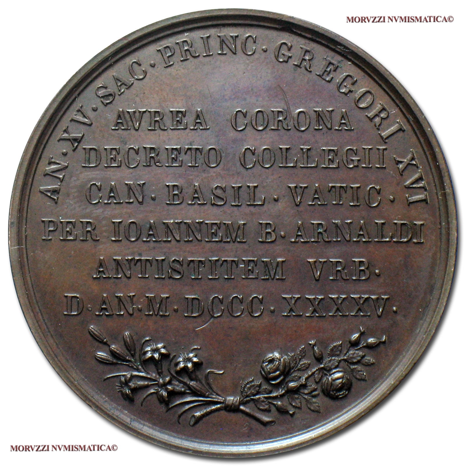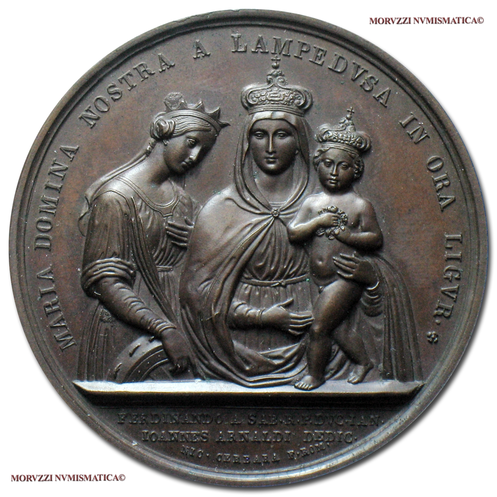 Stato Pontificio, GREGORIO XVI, Cappellari, 1831-1846, MEDAGLIA STRAORDINARIA IN BRONZO, Incoronazione della Madonna di Lampedusa in Castellano (Liguria), Emissione: 1845, D/ MARIA DOMINA NOSTRA A LAMPEDUSA IN ORA LIGVR ✠, busto della Madonna coronata, paludata e velata col Bambino coronato in piedi a d. e Santa Caterina d'Alessandria a s.; in esergo: FERDINANDO A SAB • R • P • DVC • IAN • / IOANNES ARNALDI DEDIC •; in basso, circolarmente: NIC • CERBARA F • ROM •, R/ AN • XV • SAC • PRINC • GREGORI XVI, nel campo: AVREA CORONA / DECRETO COLLEGII / CAN • BASIL • VATIC • / PER IOANNEM B • ARNALDI / ANTISTITTEM VRB • / D • AN • M • DCCC • XXXXV •; sotto: steli di giglio e rosa decussati, Opus Nicola Cerbara, Rif. bibl. Patrignani, 99; Boccia, 198; Metallo: AE, gr. 43,28, (MP54358), Diam.: mm. 43,48, qFDC, (R)