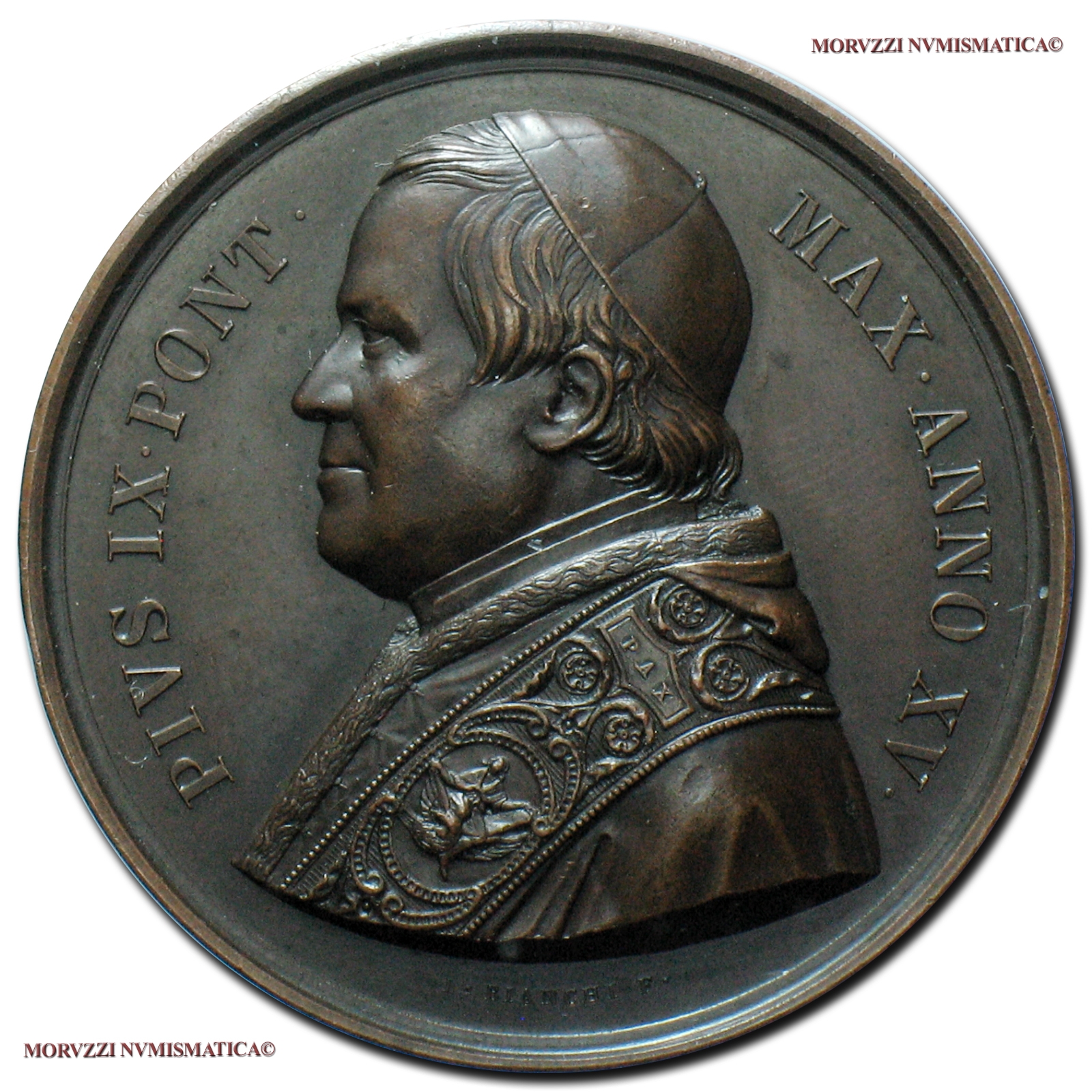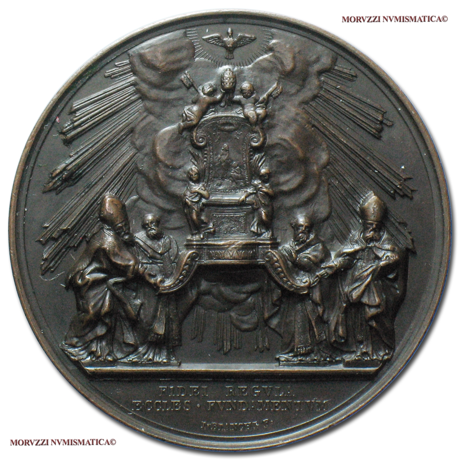 Stato Pontificio, PIO IX, Mastai Ferretti, 1846-1878, MEDAGLIA ANNUALE IN BRONZO, La cattedra di San Pietro, Emissione: 1860 ANNO XV, D/ PIVS IX • PONT • MAX • ANNO XV •, busto a s., con berretto, mozzetta e stola; sotto: I • BIANCHI F •, R/ Il trono di San Pietro del Bernini nell'abside principale della Basilica Vaticana; in esergo: FIDEI REGVLA / ECCLES • FVNDAMENTVM / I • BIANCHI F •, Opus Ignazio Bianchi, Rif. bibl. Bart. E860; Metallo: AE, gr. 38,55, (MP43241), Diam.: mm. 43,90, mSPL
