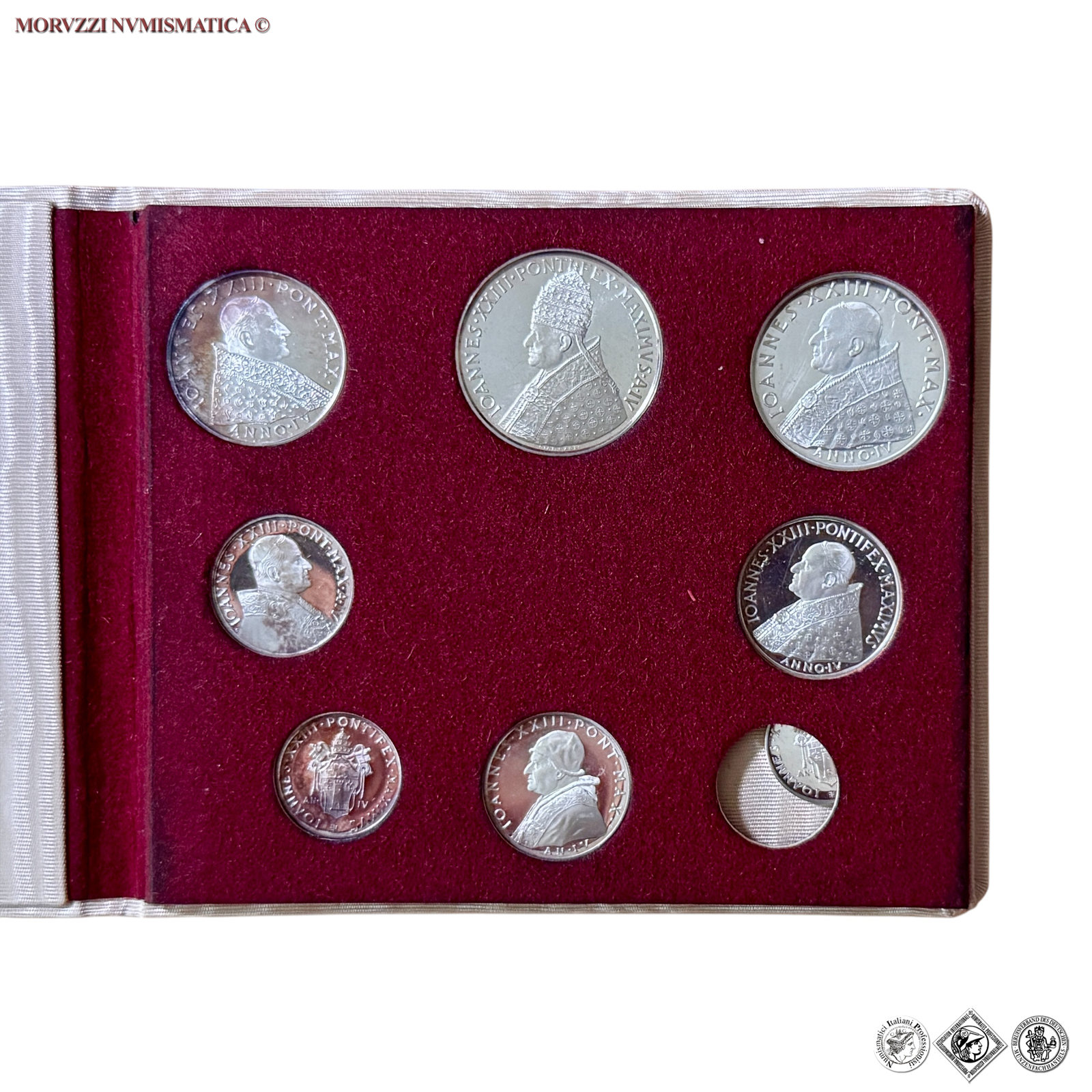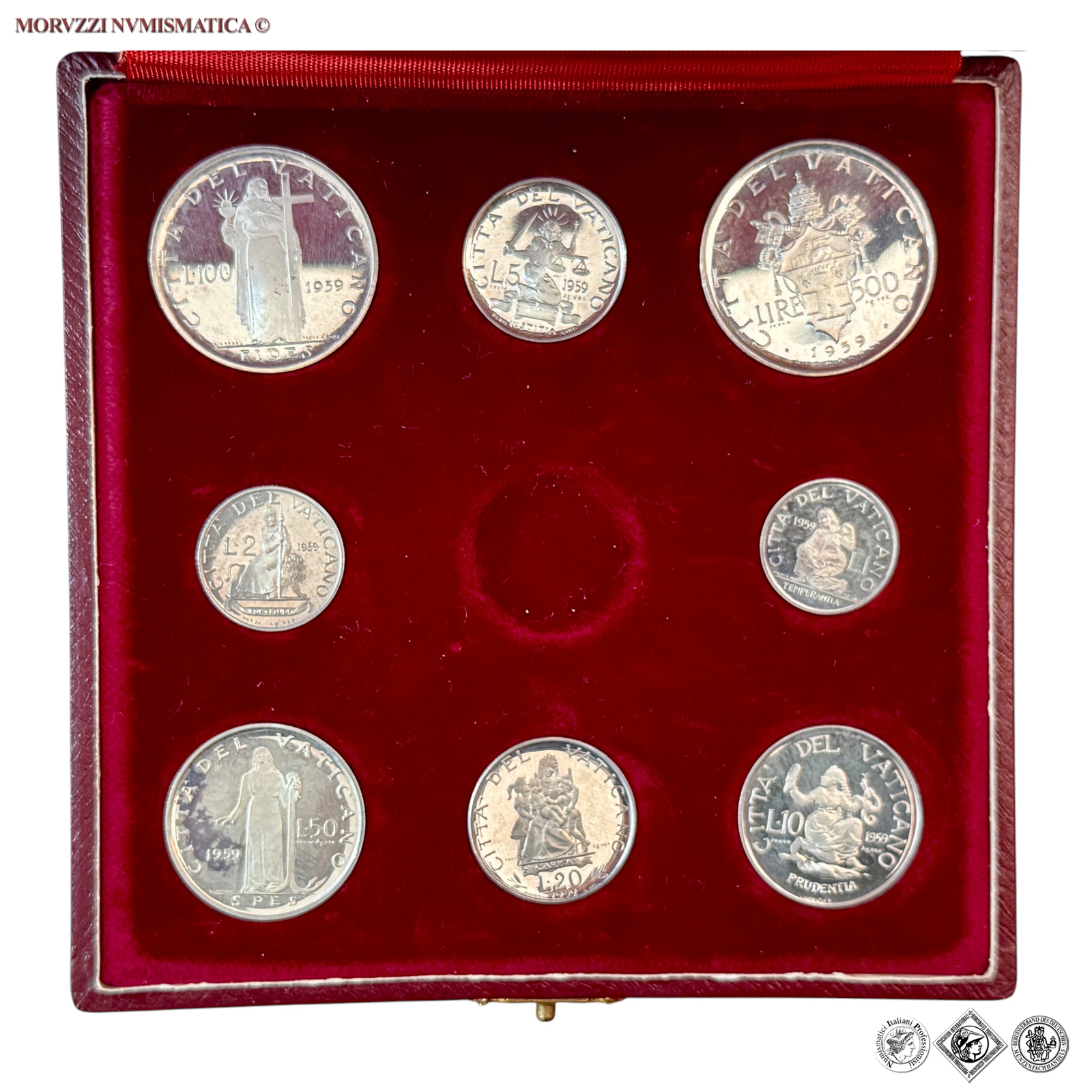 Città del Vaticano, GIOVANNI XXIII, Roncalli, SERIE ANNUALE DI 8 VALORI, PROVA ARGENTO, 1959 ANNO I, Zecca di Roma, FDC, (RRR), (Montenegro 270) / monete vaticane rare d'argento (divisionale rara ufficiale - divisionali da collezione)
