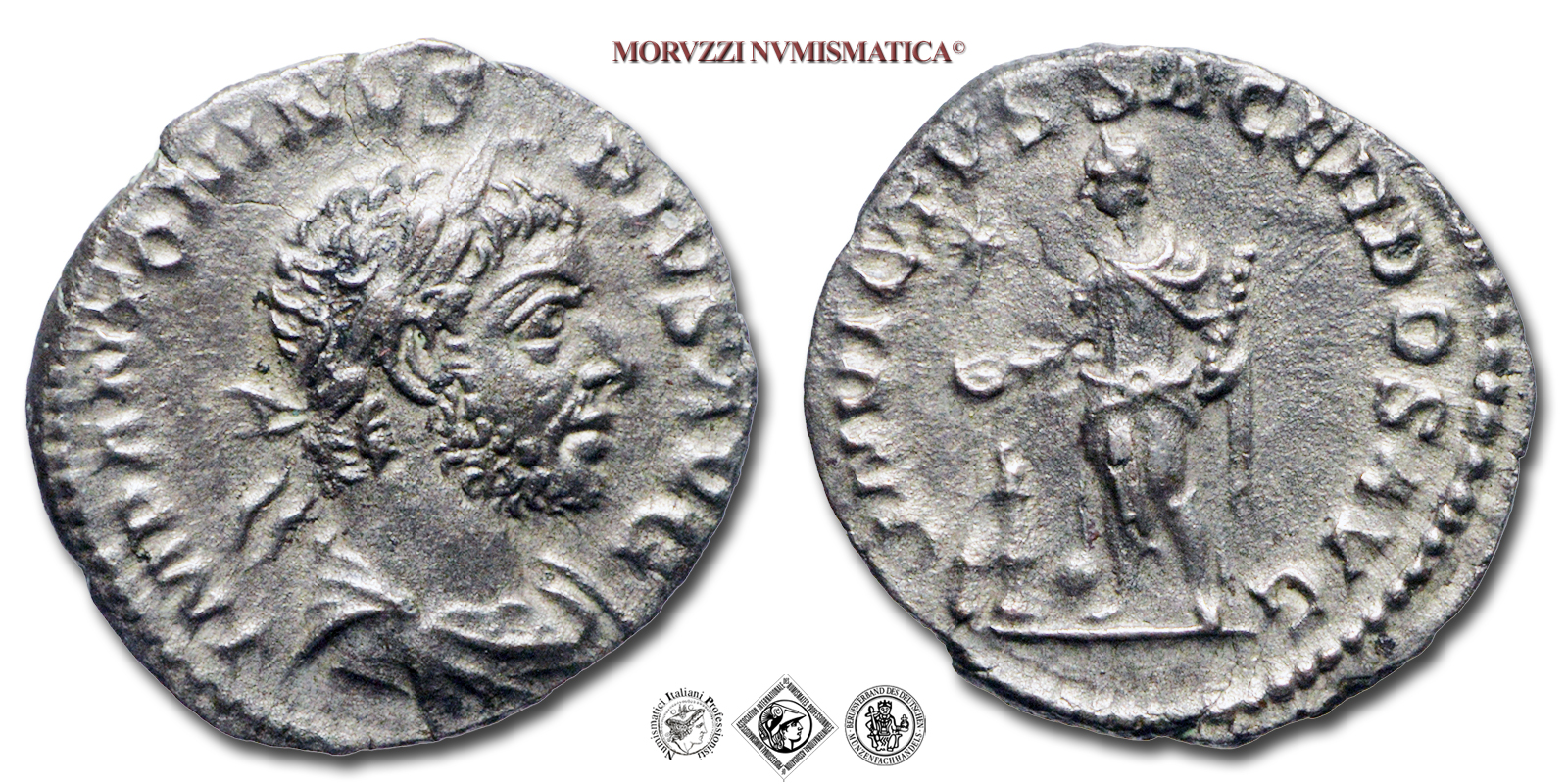 CARACALLA, DENARIO, 215 d.C., VENVS VICTRIX Venere appoggiata ad uno scudo posto sopra un elmo, tiene una Vittoria e la lancia, Zecca di Roma, ARGENTO, SPL, (RIC 311b) / monete romane imperiali antiche d'argento (moneta romana imperiale antica della dinastia dei Severi - Impero Romano)