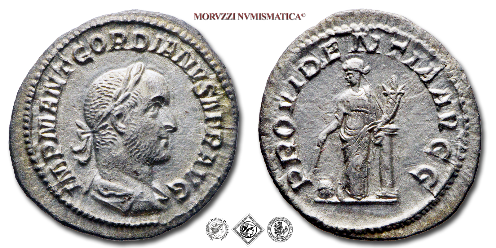 GORDIANO II, DENARIO, 238 d.C., PROVIDENTIA AVGG la Providentia drappeggiata, stante in piedi con le gambe incrociate, gomito sinistro appoggiato su una colonna, tiene nella mano destra una bacchetta rivolta verso il basso posta sopra un globo e nella mano sinistra una cornucopia, Zecca di Roma, ARGENTO, SPL, (RR), (RIC 1/R2) / monete romane imperiali antiche rare d'argento (moneta romana imperiale antica rara - Impero Romano)