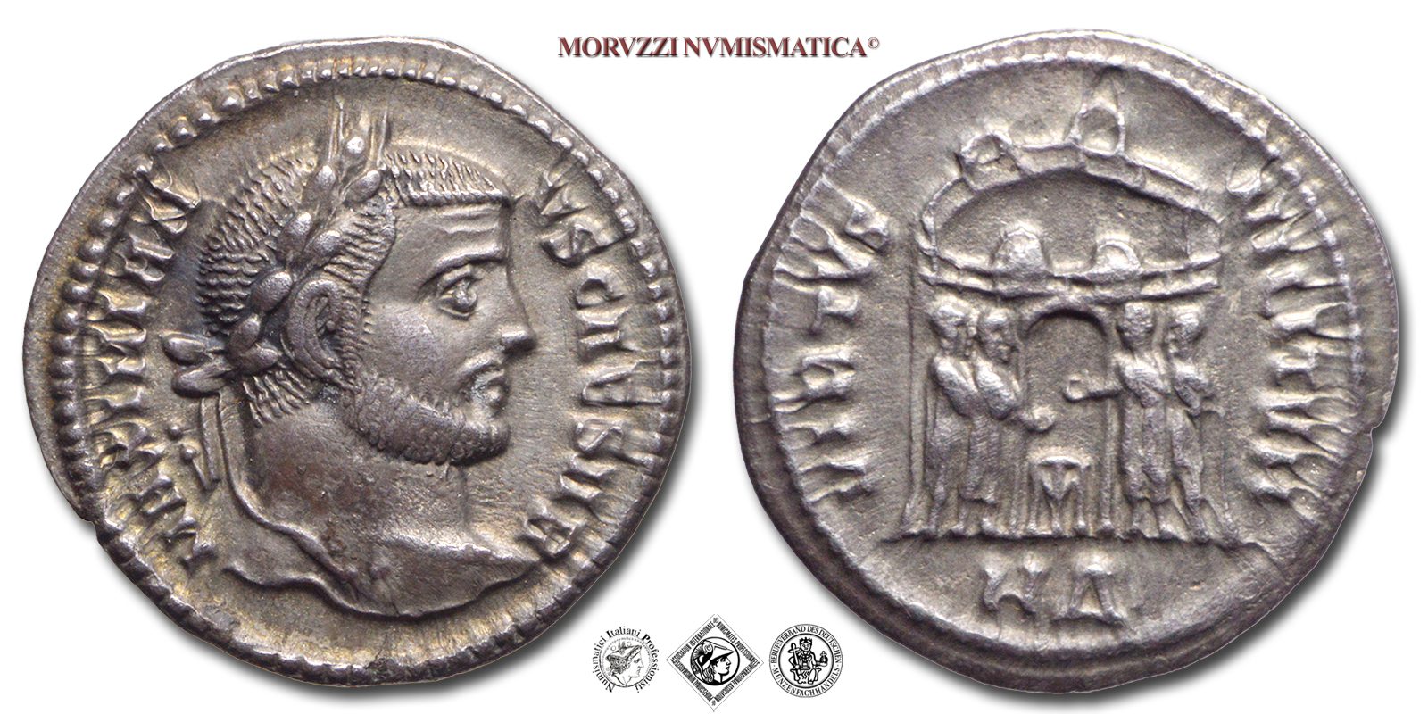 GALERIO MASSIMIANO, ARGENTEO, 295 d.C., VIRTVS MILITVM / H A i quattro tetrarchi sacrificano sopra un tripode davanti una porta d'accampamento con otto torrette, Zecca di Eraclea, ARGENTO, SPL, (RR), (RIC 4/R4) / monete romane imperiali antiche rare d'argento (moneta romana imperiale antica rara della Tetrarchia - Impero Romano)