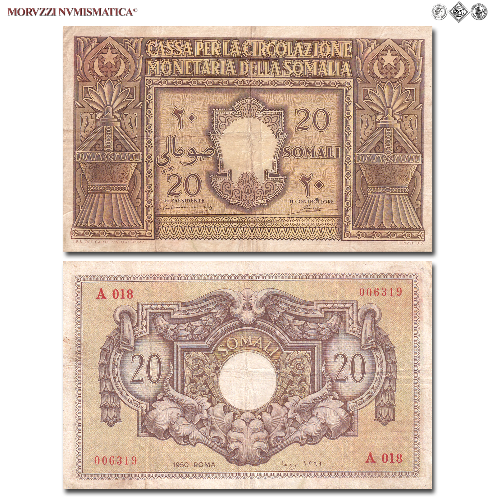 Somalia, Amministrazione Fiduciaria Italiana della Somalia (A.F.I.S.), CASSA PER LA CIRCOLAZIONE MONETARIA DELLA SOMALIA, SOMALI 20, 1950, Firme: Ciancimino, Inserra, BB, (R), (Crapanzano OI134) / banconote rare (cartamoneta rara - banconota da collezione)