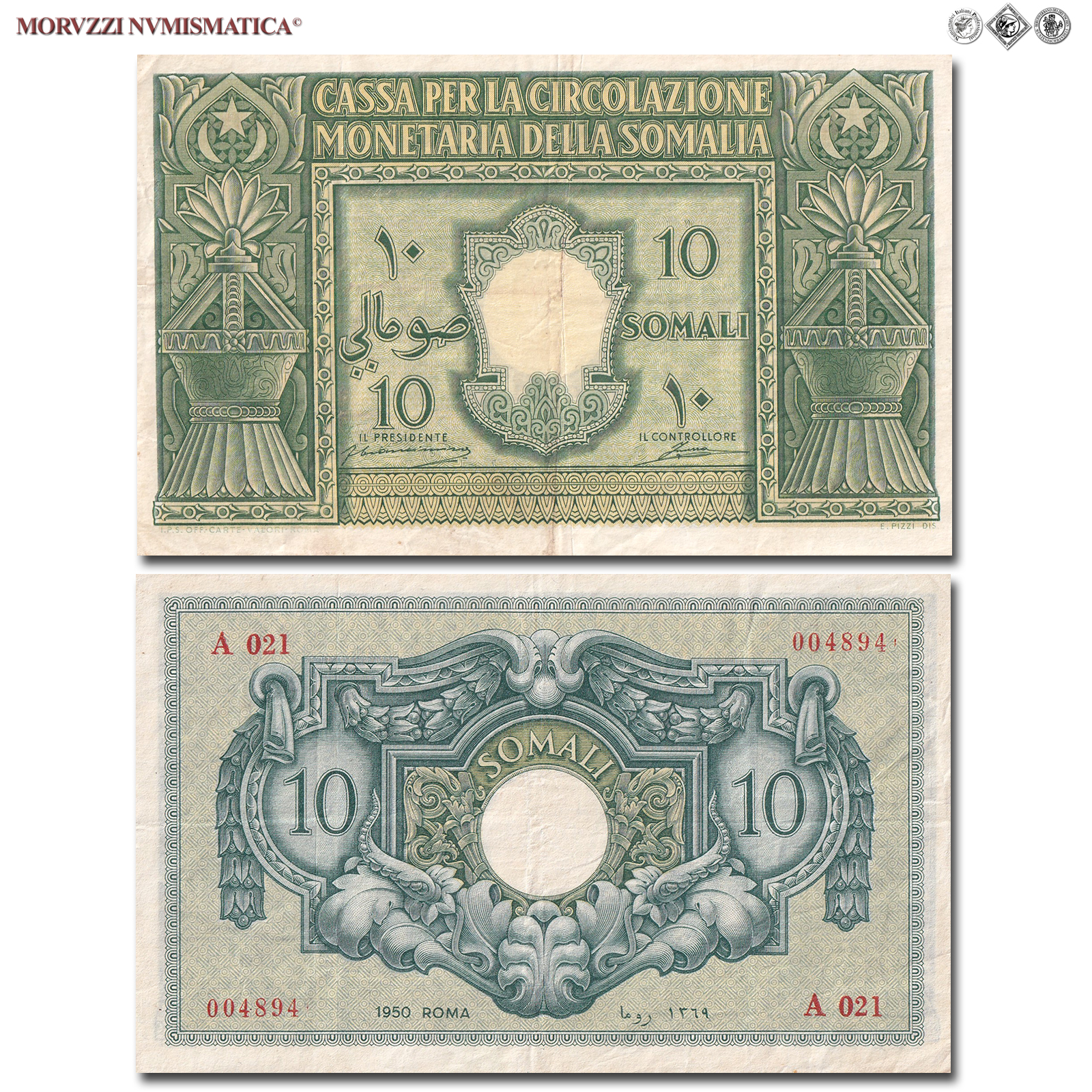 Somalia, Amministrazione Fiduciaria Italiana della Somalia (A.F.I.S.), CASSA PER LA CIRCOLAZIONE MONETARIA DELLA SOMALIA, SOMALI 10, 1950, Firme: Ciancimino, Inserra, mBB, (R), (Crapanzano OI131) / banconote rare (cartamoneta rara - banconota da collezione)