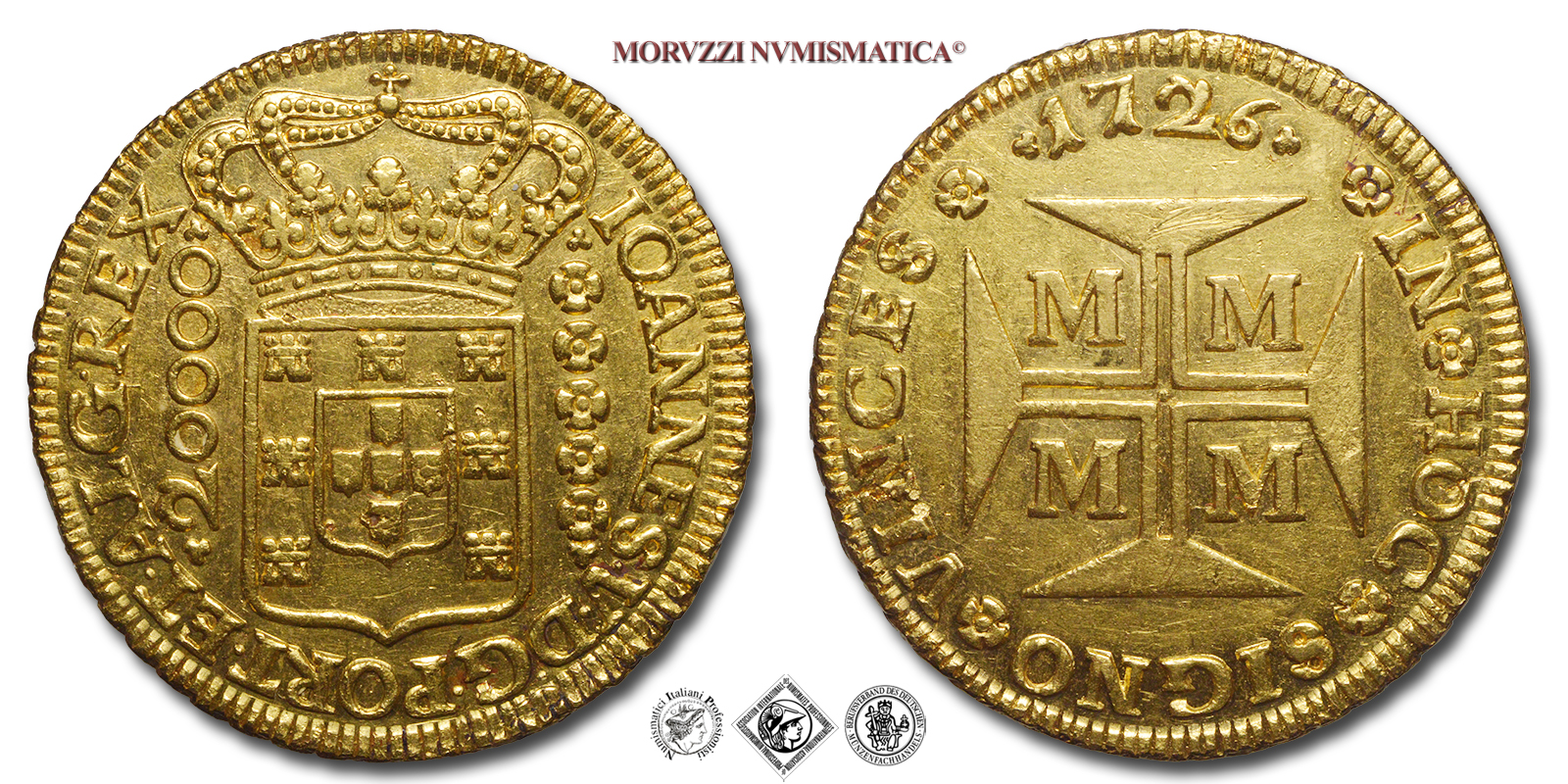 Brasile - Colonia portoghese, GIOVANNI V, REIS 20000, 1726, Zecca di Vila Rica, ORO, mSPL, (R), (KM 117) / João V Dobrao moedas de Ouro da Casa da Moeda de Vila Rica, em Minas Gerais, Brasil (World GOLD coins - monete mondiali brasiliane rare d'oro - moneta mondiale brasiliana rara da collezione)
