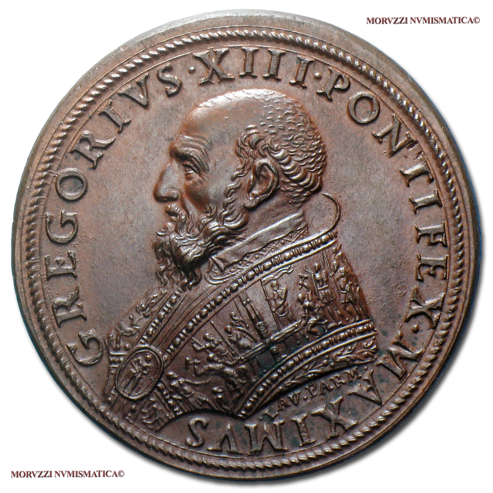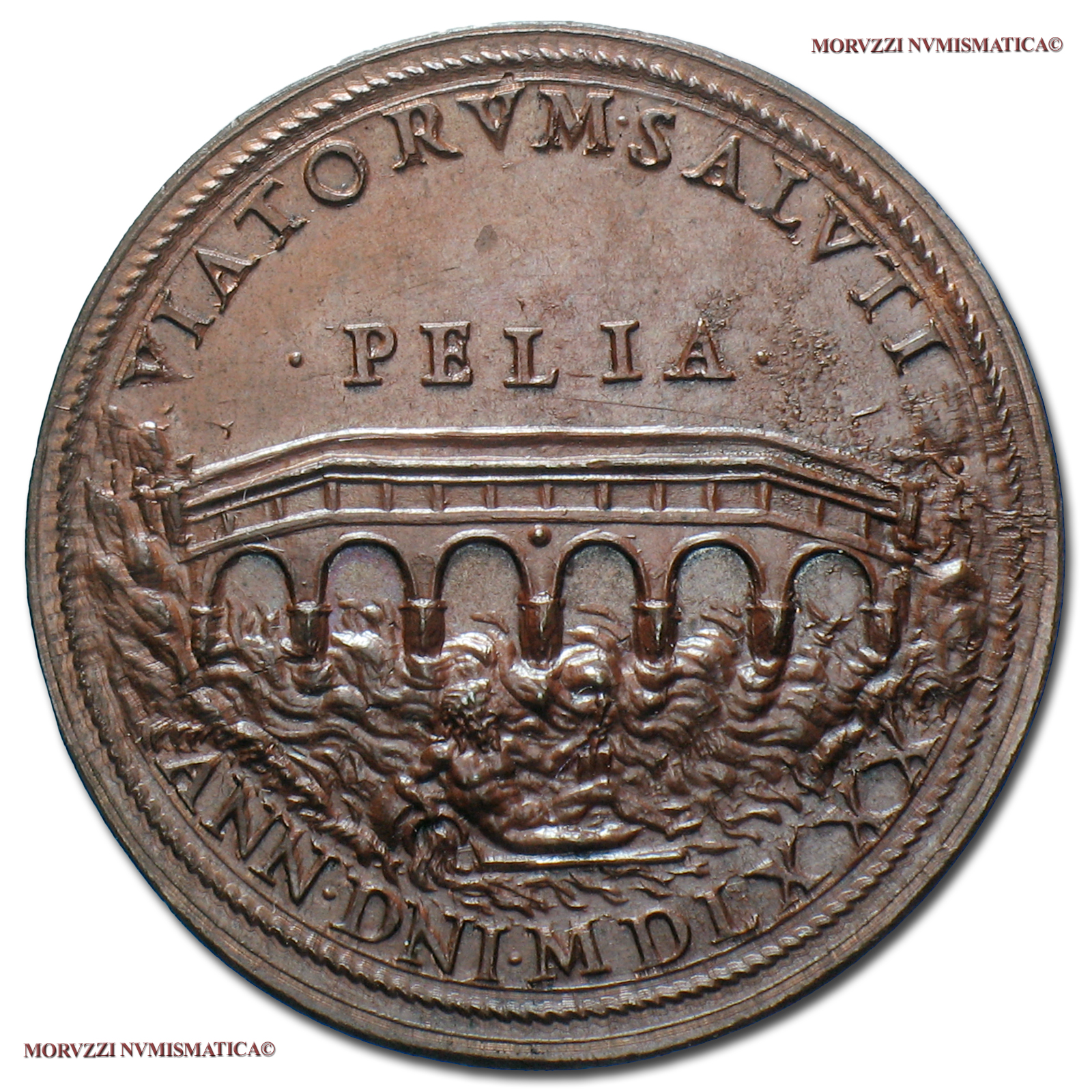 Stato Pontificio, GREGORIO XIII, Boncompagni, 1572-1585, MEDAGLIA IN BRONZO RICONIO DEL XVI-XVII SECOLO, Costruzione del Ponte Gregoriano sul fiume Paglia, Emissione: 1580, D/ GREGORIVS • XIII • PONTIFEX • MAXIMVS, busto a s. con piviale; sotto: • LAV. PARM •, R/ VIATORVM • SALVTI / ANN • DNI • MDLXXX, il ponte Gregoriano sul fiume Paglia nei pressi di Acquapendente; in basso: figura distesa verso d. che versa acqua; nel campo: • PELIA •, Opus Lorenzo Fragni, Rif. bibl. Modesti, 777; Metallo: AE, gr. 31,90, (MP141038), Diam.: mm. 40,00, qFDC, (R)