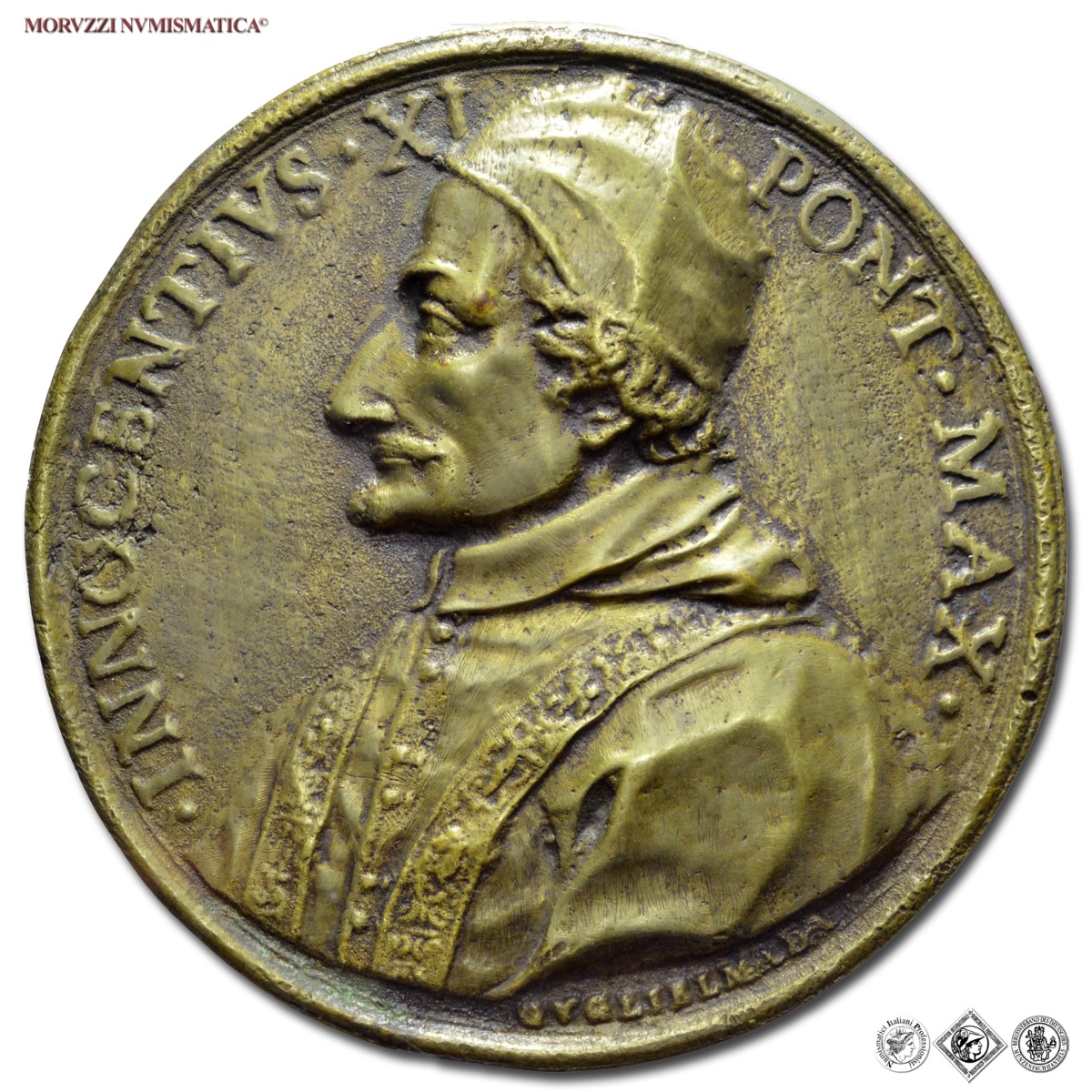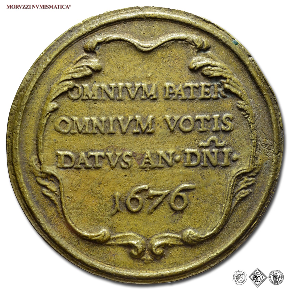 Stato Pontificio, INNOCENZO XI, Odescalchi, 1676-1689, MEDAGLIA STRAORDINARIA FUSA IN BRONZO, Auspicio di Vittoria sui Turchi, Emissione: 1676, D/ • INNOCENTIVS • XI PONT • MAX •, busto con camauro, mozzetta e stola a s.; sotto: GVGLIELMADA, R/ in cartella a fogliami, su quattro righe: OMNIVM PATER / OMNIVM VOTIS / DATVS AN • DNI • / 1676, Opus Giovan Battista Guglielmada, Rif. bibl. Miselli, 92; Lincoln, 1407; Metallo: AE, gr. 104,42, (MP152195), Diam.: mm. 75,65, SPL, (RR)
