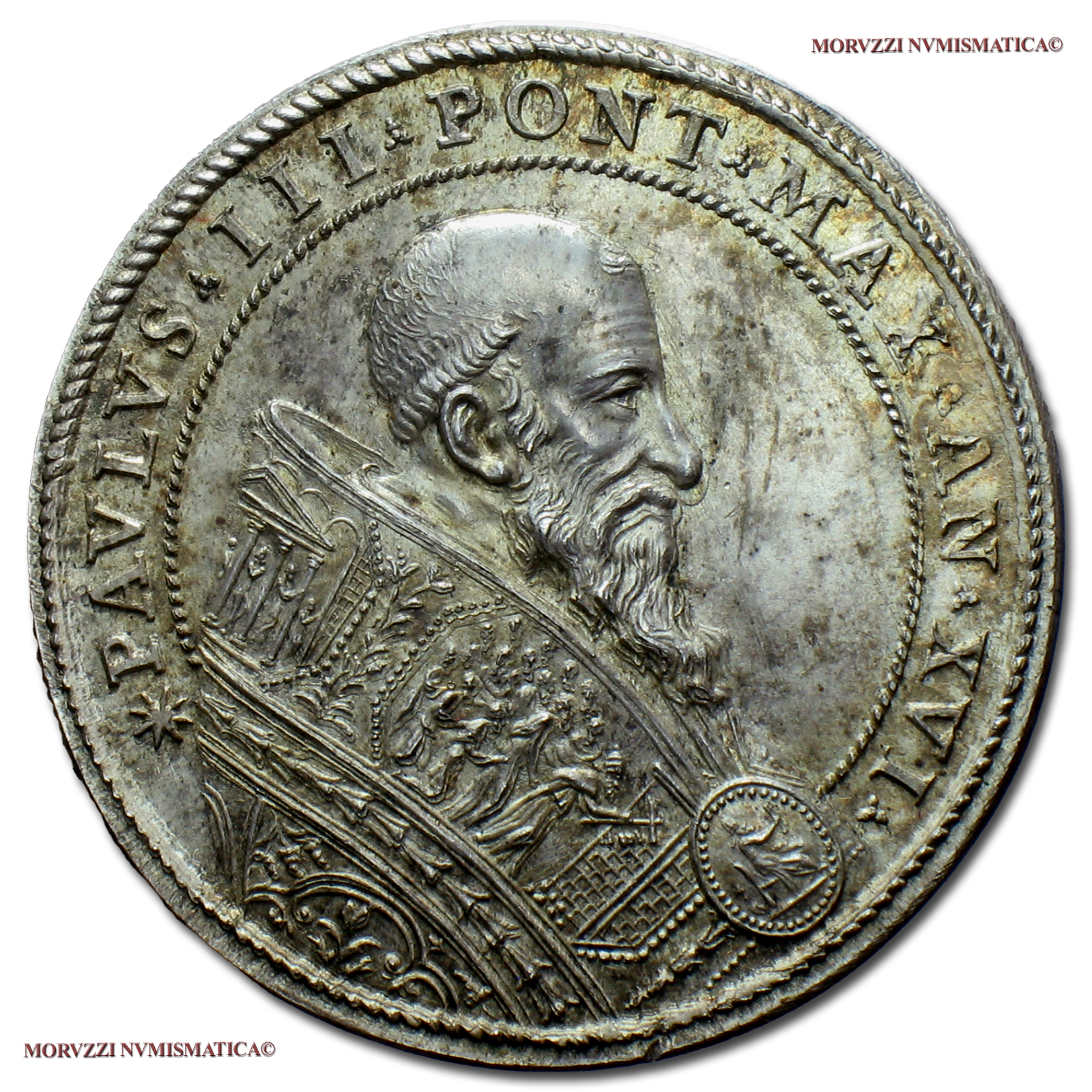 Stato Pontificio, PAOLO III, Farnese, 1534-1549, MEDAGLIA POSTUMA IN ARGENTO, Ganimede e l'aquila, Emissione: 1549 AN XVI, D/ * PAVLVS • III • PONT • MAX • AN • XVI •, busto con piviale a d., R/ OIPNH • ZHNOE •, Ganimede a s. versa acqua da anfora, alle sue spalle l'aquila; in esergo: EYPAINEI, Opus Alessandro Cesati detto il Grechetto, Rif. bibl. Modesti CNORP, 311; Metallo: AR, gr. 30,39, (MP141230), Diam.: mm. 41,69, FDC, (RR)