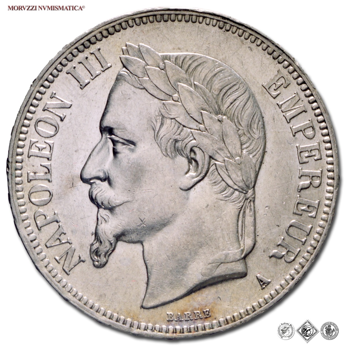 Francia, NAPOLEONE III, 1852-1870, FRANCHI 5, Emissione: 1868 A, D/ NAPOLEON III EMPEREUR, testa laureata a sinistra; sotto: il nome dell'incisore (BARRE); in basso, lungo il bordo a destra: la sigla della zecca (A), R/ EMPIRE FRANÇAIS, stemma coronato e ammantato divide la denominazione (5 F.); sotto: la data (1868), Zecca di Parigi, Rif. bibl. Gadoury, 739; Metallo: AR, gr. 25,07, (ME113347), Diam.: mm. 37,81, FDC