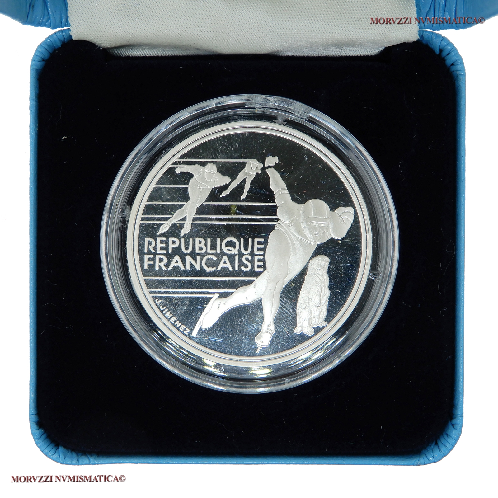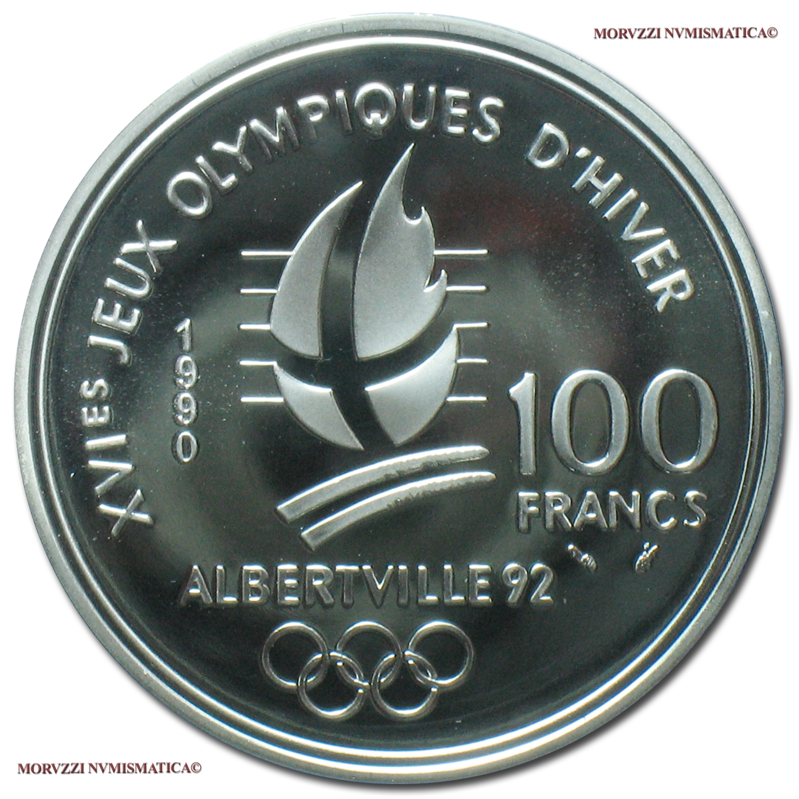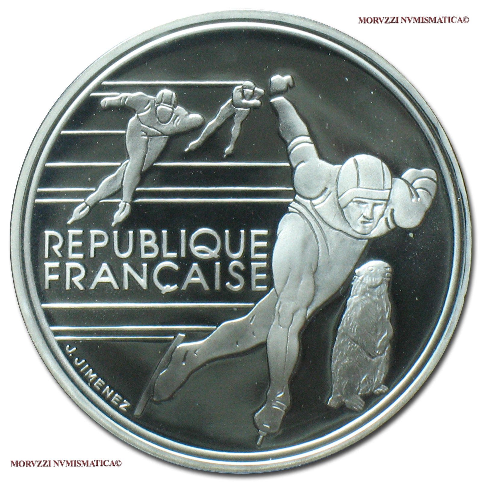 Francia, QUINTA REPUBBLICA, dal 1959, FRANCHI 100, XVI Giochi Olimpici - Albertville '92, Pattinaggio di velocità, Emissione: 1990, D/ REPUBLIQUE FRANÇAISE (su due righe), pattinatori di velocità e marmotta alpina; in basso, a s., lungo il bordo: J. JIMENEZ (sigla dell'incisore Joaquin Jimenez), R/ XVIes JEUX OLYMPIQUES D'HIVER, la fiamma incrociata tra la data (1990) e la denominazione (100 / FRANCS); sotto: ALBERTVILLE 92 e il logo olimpico, Zecca di Parigi, Rif. bibl. KM, 980; Metallo: AR, gr. 22,2, (ME60369), Diam.: mm. 37,00, FS