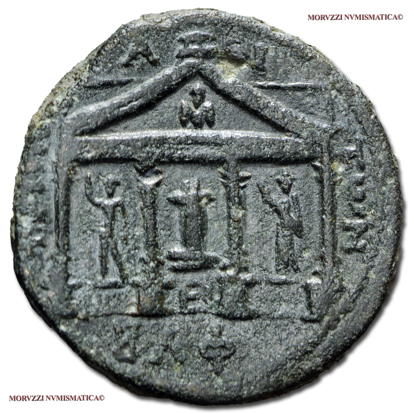 Impero Romano, Fenicia, GIULIA DOMNA, Moglie di Settimio Severo, 193-211 d.C., BRONZO, Emissione: 215-216 d.C., D/ IOYΛIA CEBACTH, busto drappeggiato a destra, R/ TPI-ΠO-ΛI-TΩN, tempio tetrastilo di Zeus Hagios con un'aquila nel frontone; al centro: altare; ai lati: statue di Helios e Selene; in esergo: ZKΦ (data), Zecca di Tripoli*, Rif. bibl. B.M.C., 73; Rouvier, VI, 1721; Metallo: AE, gr. 15,83, (MR99359), Diam.: mm. 27,22, BB, (NC)