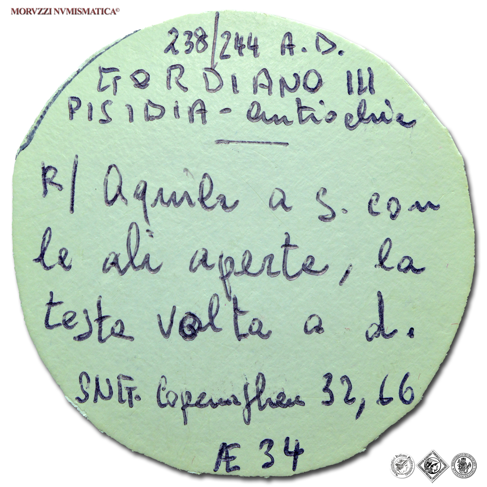 Impero Romano, Pisidia, GORDIANO III PIO, 238-244 d.C., BRONZO, Emissione: 238-244 d.C., D/ IMP CAES M ANT GORDIANVS AVG, busto laureato con paludamento e corazza a destra, R/ COL CAES ANTIOCH / S R, aquila ad ali spiegate stante di fronte con la testa volta a destra, Zecca di Antiochia, Rif. bibl. SNG Dan., 32, 66; B.M.C., 19,93; Metallo: AE, gr. 23,82, (MR26831), Diam.: mm. 33,74, BB