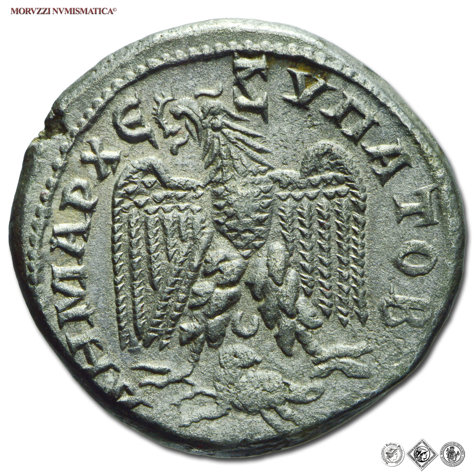 Impero Romano, Siria, GORDIANO III PIO, 238-244 d.C., TETRADRAMMA, Emissione: 242 d.C., D/ AYTOK K M ANT #GORDIANO#C CEB, busto laureato, paludato e corazzato a d., R/ #D#HMAPX E#X# #UPATO# B, aquila stante di fronte ad ali aperte, volta a s., tiene nel becco una corona. Tra le zampe una semiluna e sotto un ariete andante a s., Zecca di Antiochia, Rif. bibl. Prieur, 295; Metallo: AR, gr. 12,58, (MR148302), Diam.: mm. 26,28, SPL