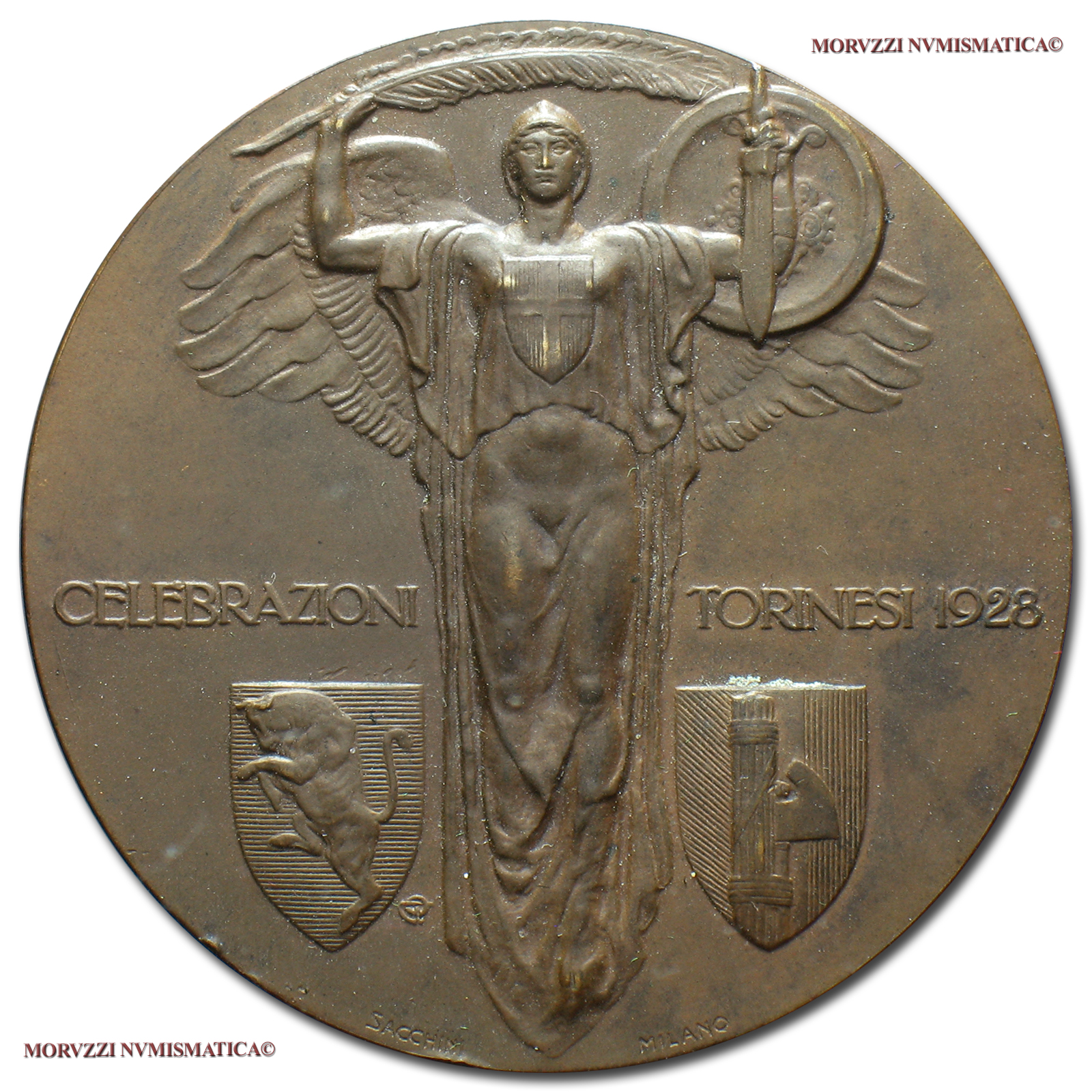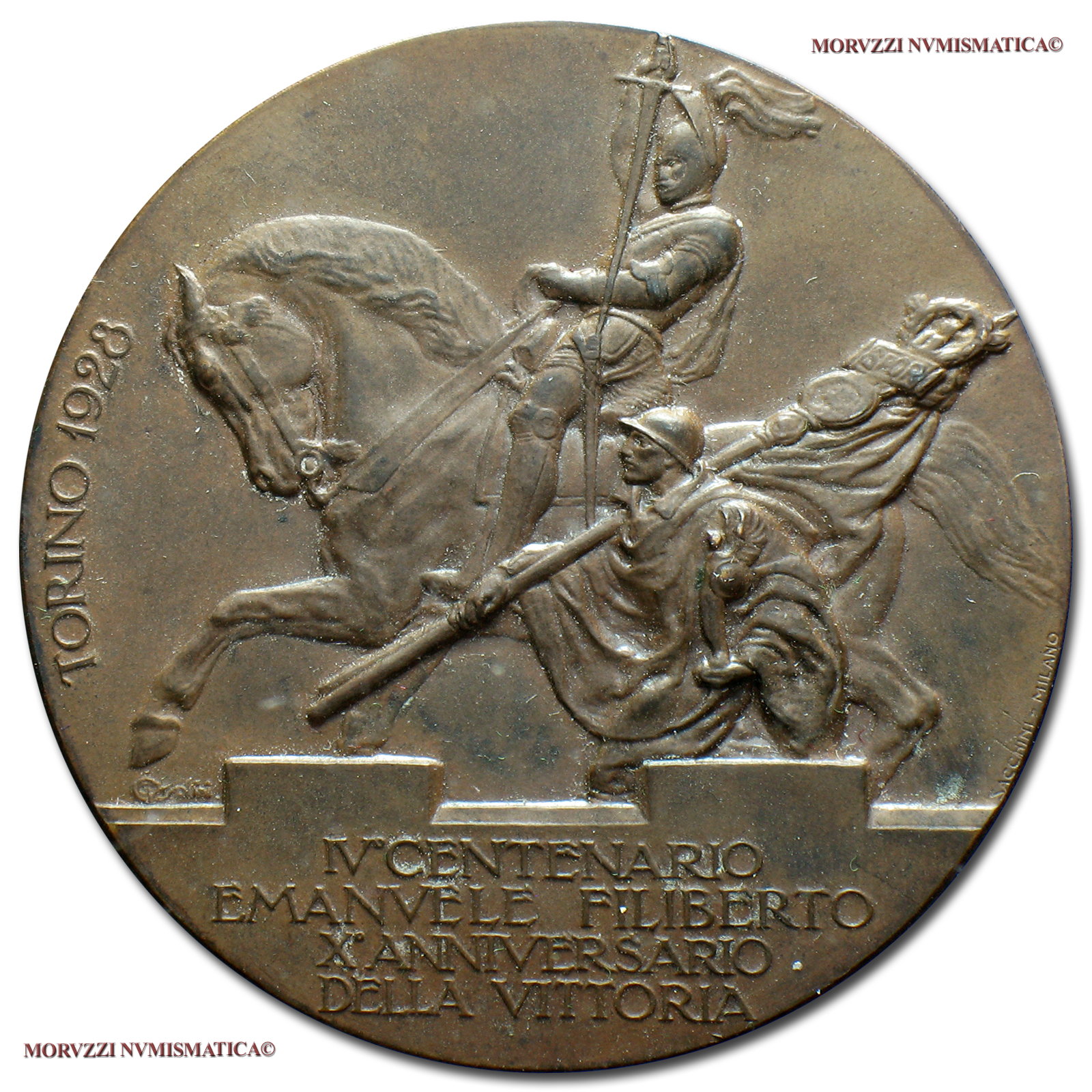 Medaglia coniata, realizzata nel 1928 a ricordo delle Celebrazioni Torinesi per il decimo anniversario della Vittoria della Prima Guerra Mondiale e nel quattrocentesimo anniversario della nascita di Emanuele Filiberto di Savoia.