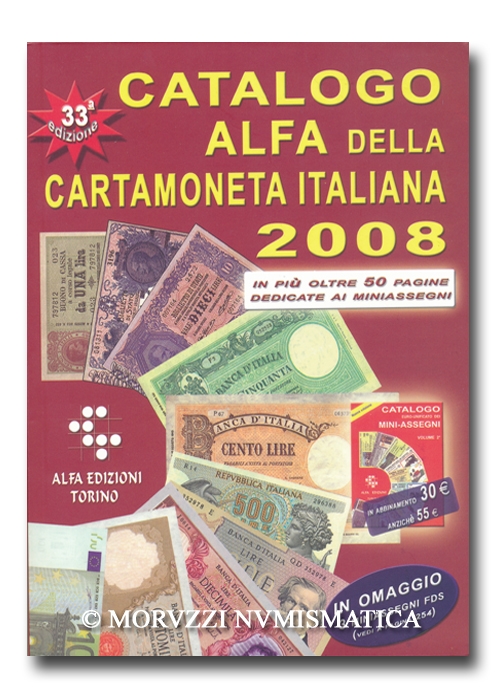 AA.VV., Catalogo Alfa della Cartamoneta Italiana 2008 (miniassegni inclusi), 33a edizione, pp. 254 con immagini a colori, Torino 2007 / cataloghi di numismatica (banconote italiane)