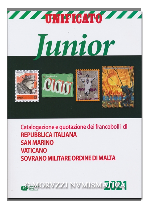 AA.VV., Unificato Junior 2021, Catalogazione e quotazione dei francobolli di Repubblica Italiana, San Marino, Vaticano, S.M. ordine di Malta / cataloghi di filatelia