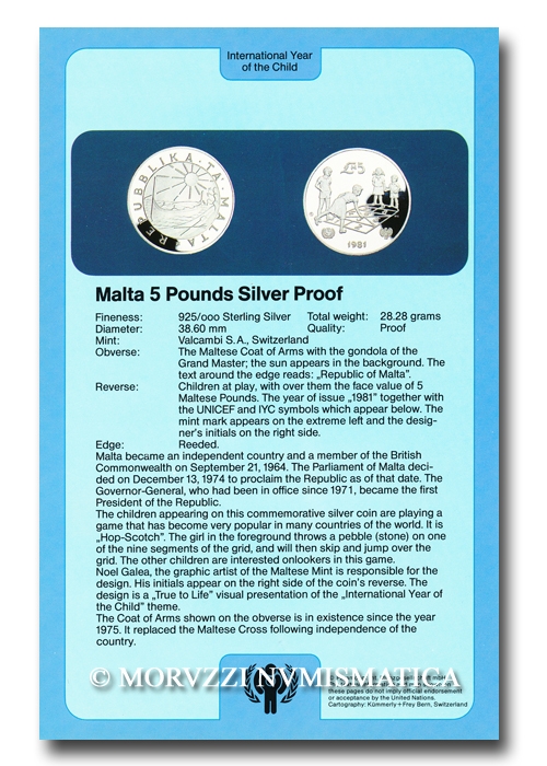 Malta, REPUBBLICA, 5 POUNDS, Anno Internazionale del Fanciullo, Emissione: 1981, Zecca di Valcambi, Rif. bibl. KM, 53; Metallo: AR, gr. 28,28, (ME117854), Diam.: mm. 38,60, FS