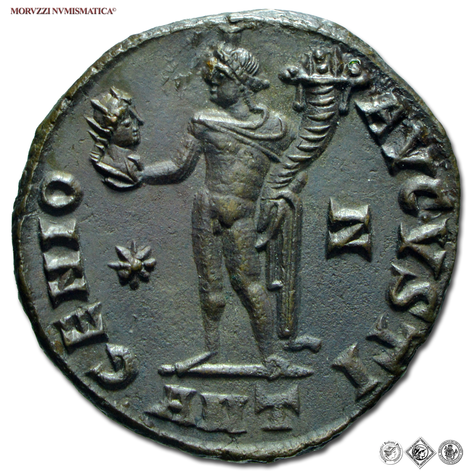Impero Romano, MASSIMINO II DAIA, 309-313 d.C., FOLLIS RIDOTTO, Emissione: 312 d.C., D/ IMP C GAL VAL MAXIMINVS P F AVG, testa laureata a destra, R/ GENIO AVGVSTI * Z / ANT, il Genio stante a sinistra con modio sulla testa, tiene la testa del Sole con la destra e una cornucopia nella sinistra, Zecca di Antiochia, Rif. bibl. R.I.C., 164b; Cohen, 21; Metallo: AE, gr. 4,38, (MR27194), Diam.: mm. 21,24, mSPL