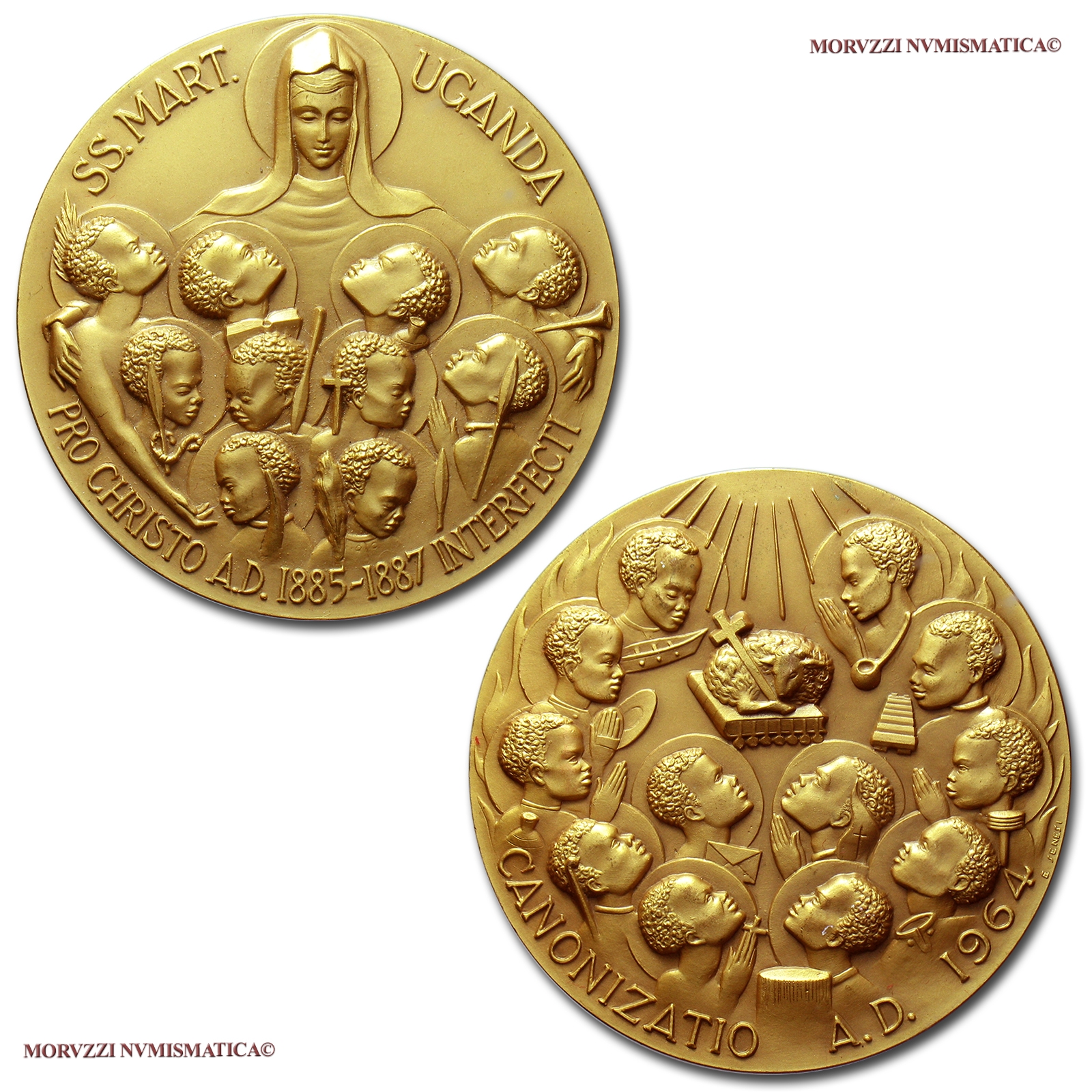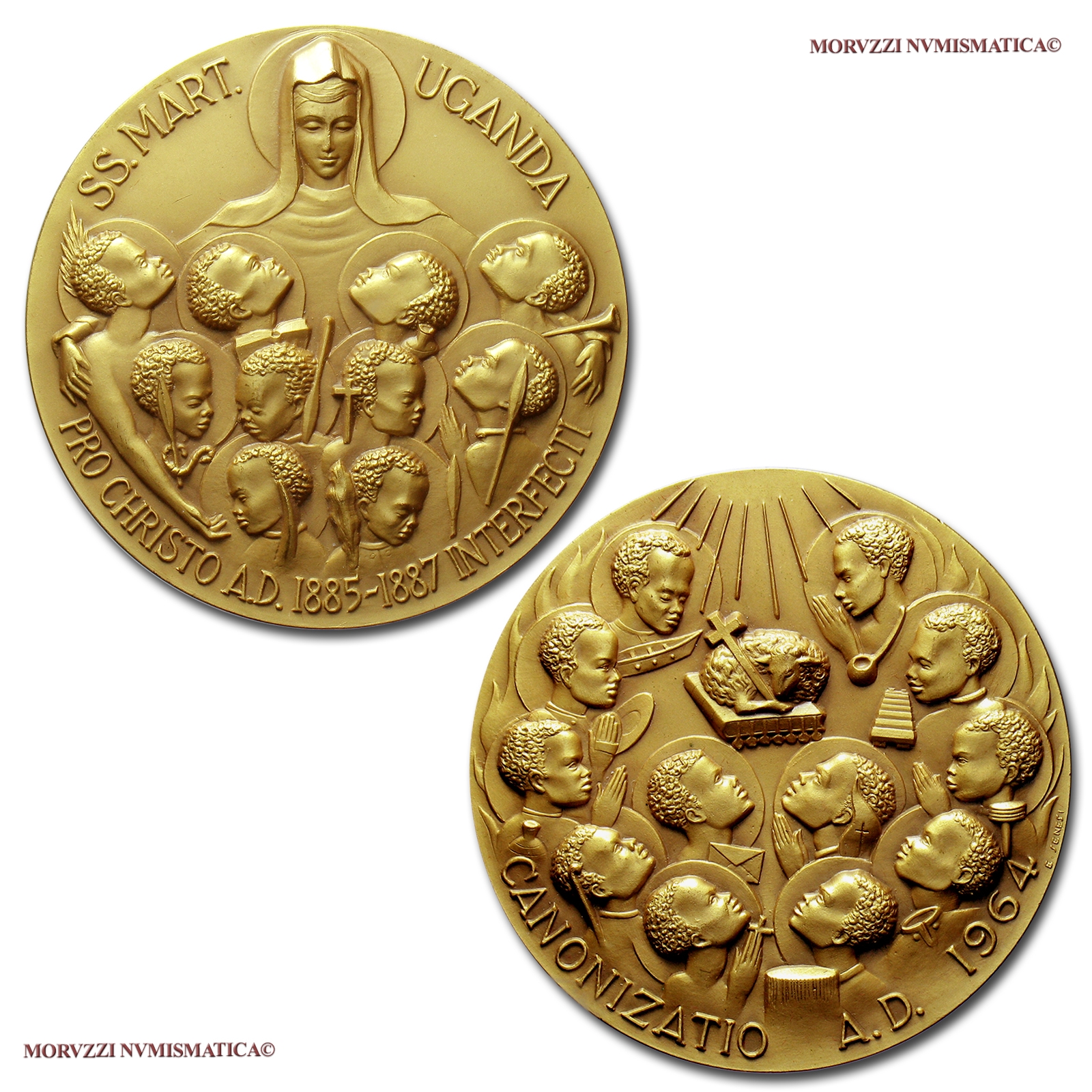 Chiesa Cattolica, SS. MARTIRI UGANDA, MEDAGLIA IN BRONZO, 1964, Beata Vergine Maria che abbraccia 10 martiri nimbati / Agnello di Dio irraggiato dallo Spirito Santo tra le teste di 12 Martiri Ugandesi nimbati, Opus E. Senesi, FDC, (RR) / medaglie rare