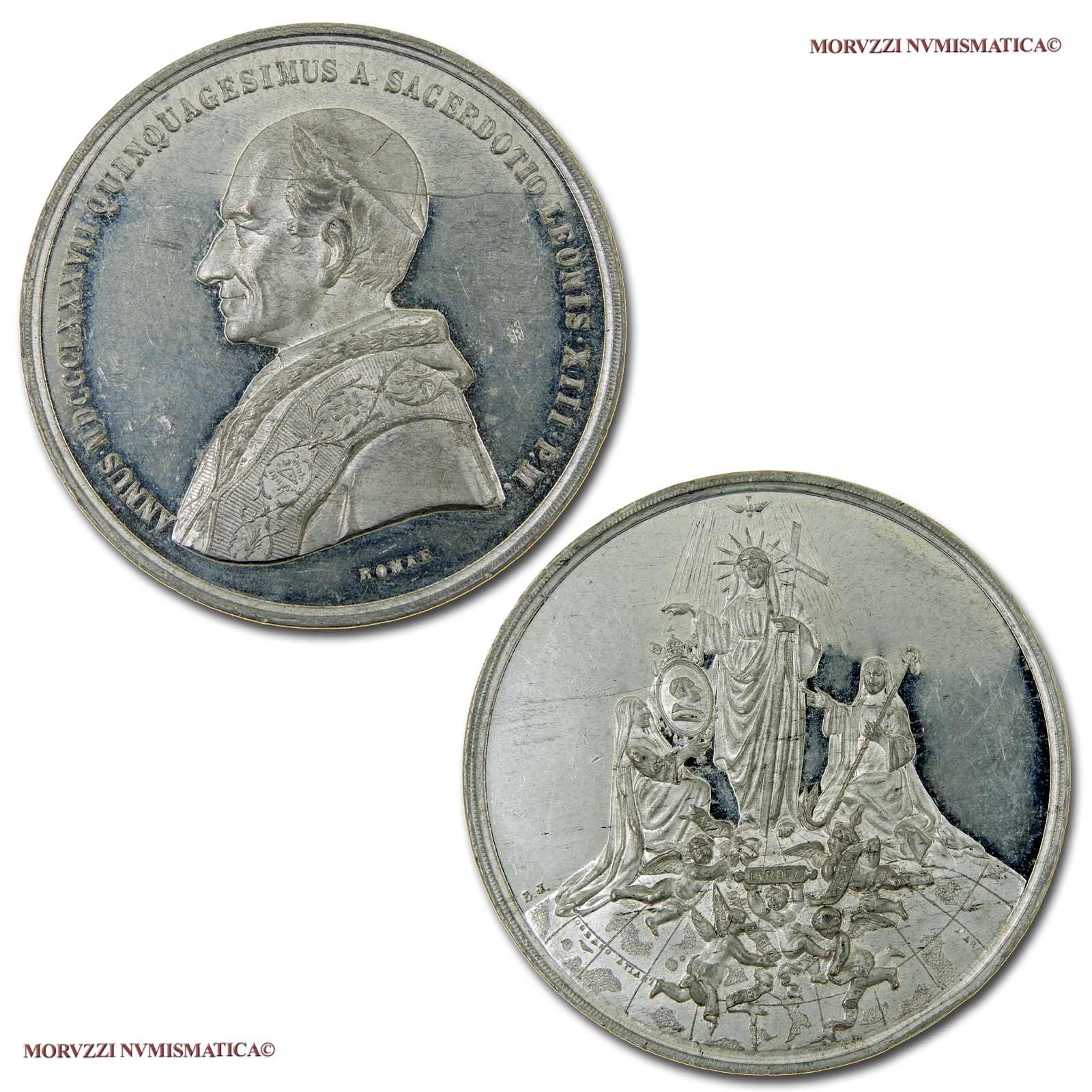Chiesa Cattolica, LEONE XIII, MEDAGLIA COMMEMORATIVA IN METALLO BIANCO, 1887, Giubileo Sacerdotale (La Chiesa sul mondo), Opus Stefano Johnson (Filippo Speranza?), qFDC, (NC), (Modesti 109) / Pope Leo XIII Pecci WHITE METAL MEDALS (medaglie papali)