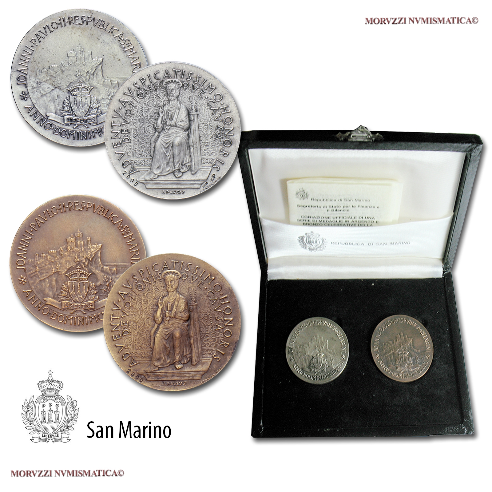 Repubblica di San Marino, DITTICO MEDAGLIE IN ARGENTO E BRONZO, 1983, Visita di Giovanni Paolo II a San Marino, Opus Pietro Giampaoli, Stabilimento Stefano Johnson di Milano, FDC / Karol Józef Wojtyła - John Paul II - Johannes Paul II. - Jean-Paul II