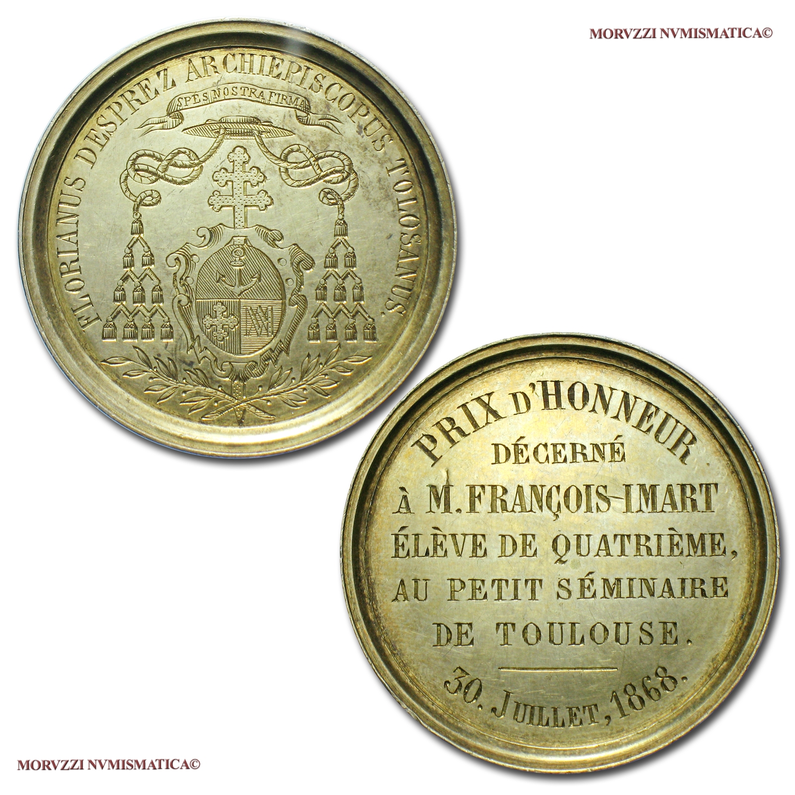 Francia - Tolosa, FLORIANO DESPREZ, MEDAGLIA IN ARGENTO VERMEIL INCISA A MANO, 1868, Premio onorario assegnato al signor Francois Imart, qFDC, (RRR) / medaglie francesi d'argento - France médaille d'argent Toulouse - French silver medal
