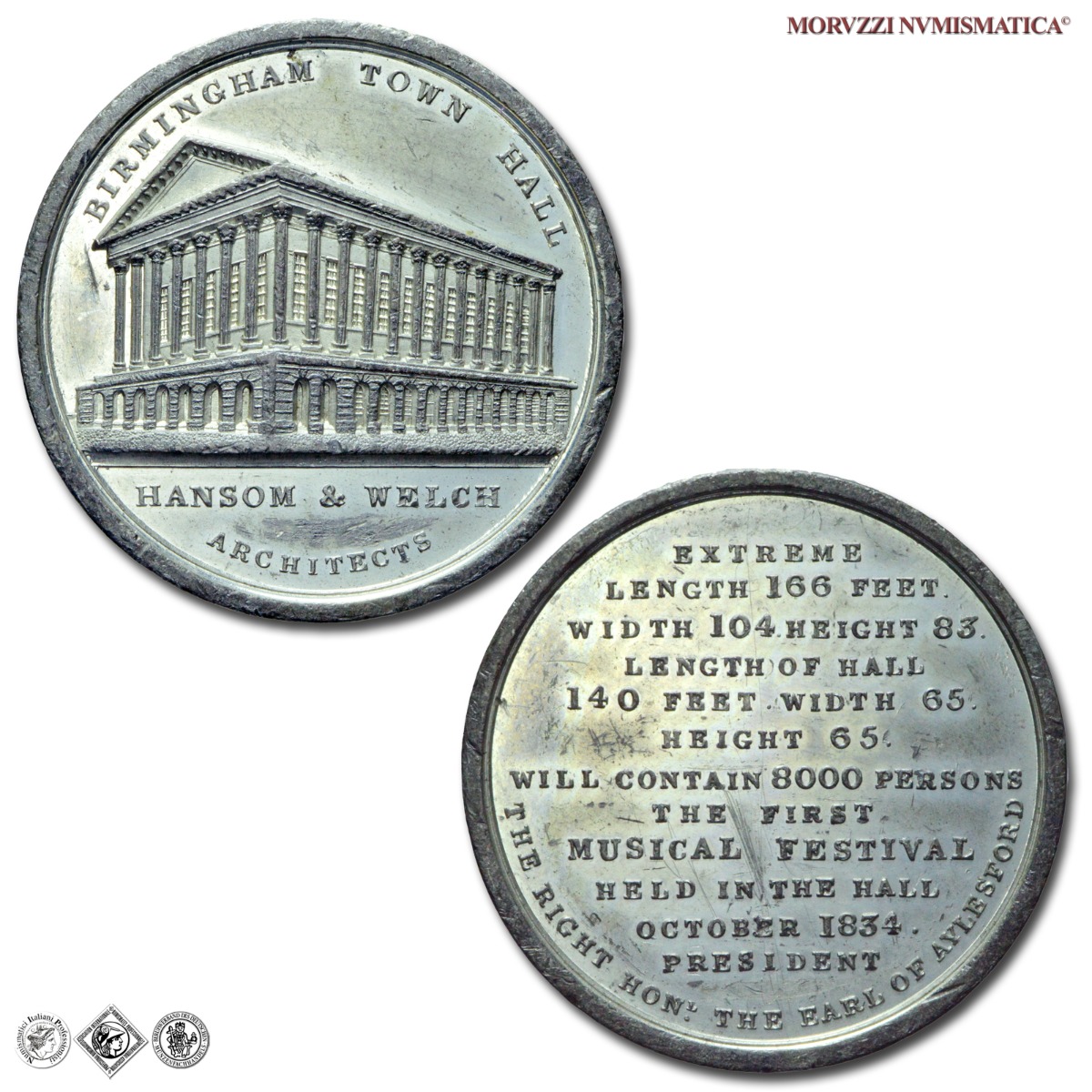 Regno Unito, BIRMINGHAM TOWN HALL, MEDAGLIA IN METALLO BIANCO, 1834, qFDC / United Kingdom (UK) WHITE METAL MEDALS (medaglie mondiali europee inglesi da collezione)
