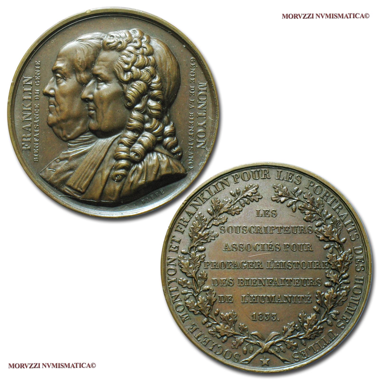 Francia, LUIGI FILIPPO I, MEDAGLIA IN BRONZO, 1833, Société Franklin et Montyon (serie degli uomini utili), Opus Barre, SPL, (Collignon 1079) / medaglie francesi moderne (médailles françaises de bronze)