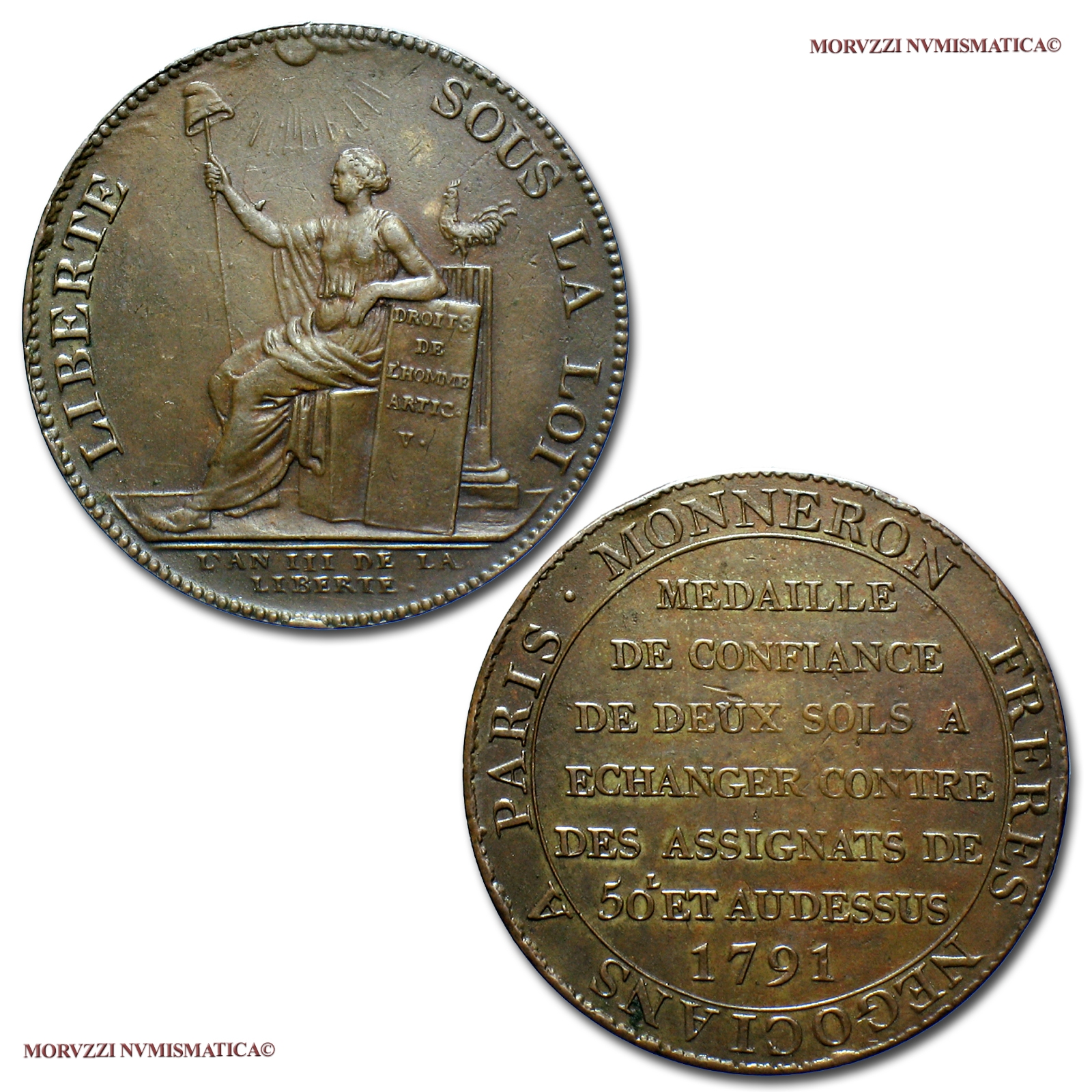 Francia, CONFIANCE, MEDAGLIA IN RAME DA 2 SOLS DEI FRATELLI MONNERON (variante con 50L.), 1791, Opus Augustin Dupré (Birmingham - Soho), mBB, (VG. 233) Révolution française MÉDAILLES DE CONFIANCE DE DEUX SOLS "MONNERON FRERES NEGOCIANS A PARIS" (medaglie)