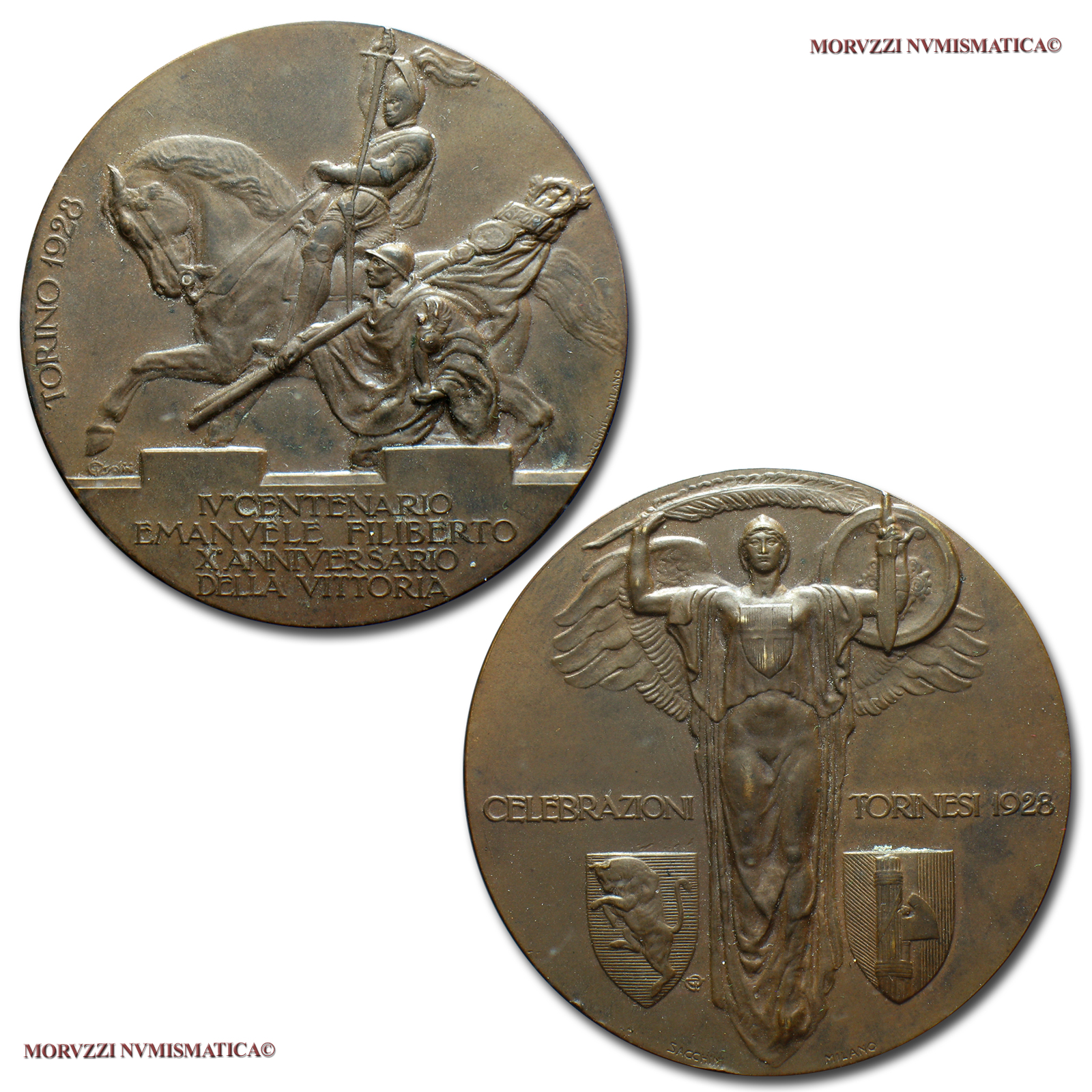 Italia, EMANUELE FILIBERTO DI SAVOIA, MEDAGLIA IN BRONZO, 1928, 400° anniversario della nascita di Emanuele Filiberto e 10° della Vittoria della Prima Guerra Mondiale, Opus Gaetano Orsolini, mSPL, (R), (Casolari VI-22) / medaglie italiane fasciste rare