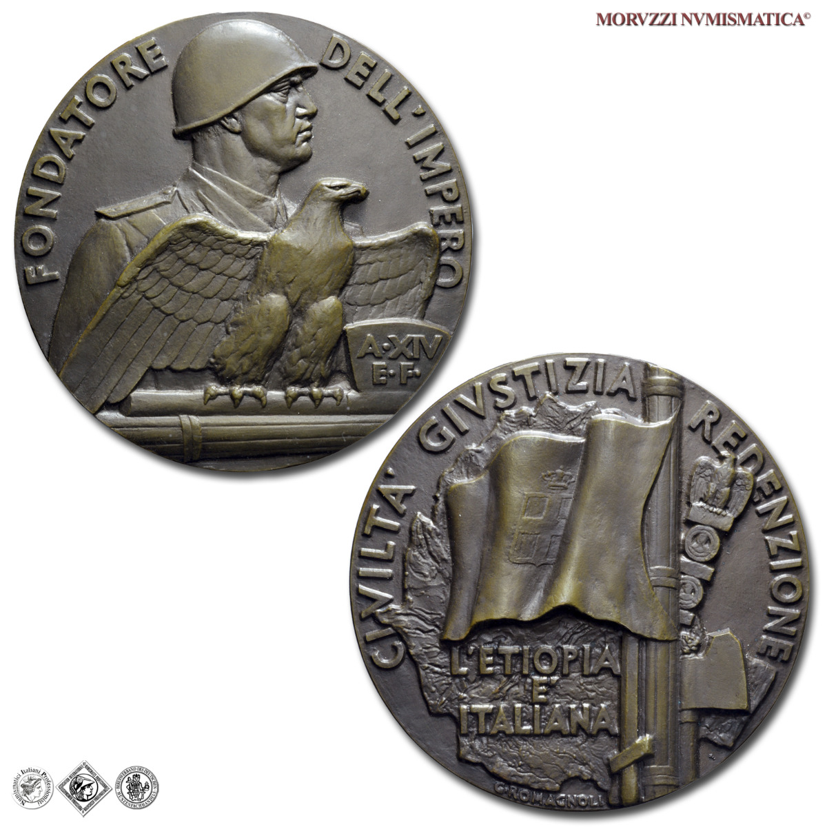 Italia, BENITO MUSSOLINI, MEDAGLIA IN BRONZO, 1936, Fondazione Impero - CIVILTA' GIVSTIZIA REDENZIONE, Opus Giuseppe Romagnoli, FDC, (RR), (Casolari XIV-40) / medaglie italiane fasciste rare del Ventennio Fascista (epoca fascista - fascismo italiano)