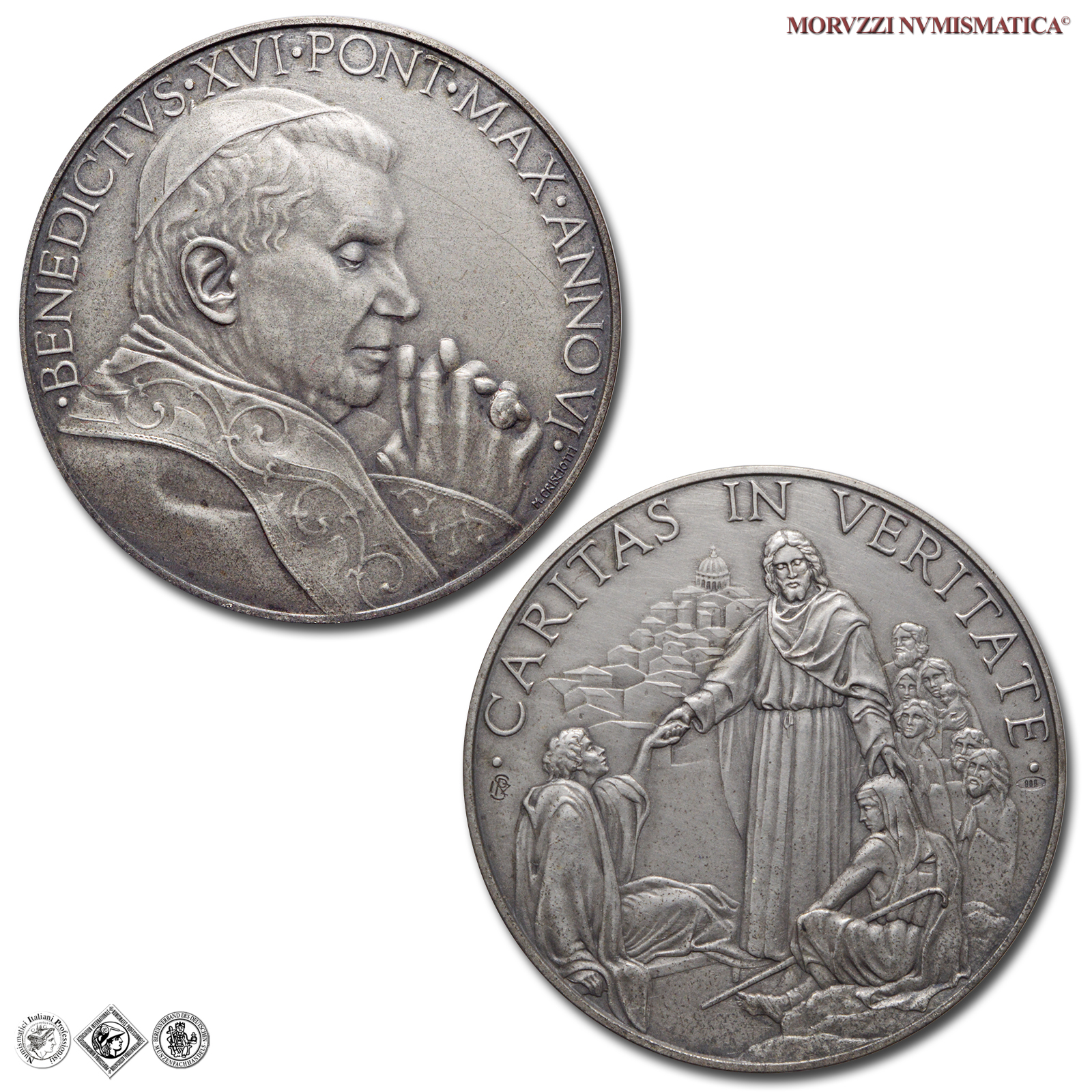 Città del Vaticano, BENEDETTO XVI, Ratzinger, MEDAGLIA ANNUALE IN ARGENTO, Caritas in veritate, ANNO VI, Opus Mariangela Crisciotti, FDC / medaglie papali pontificie vaticane annuali d'argento